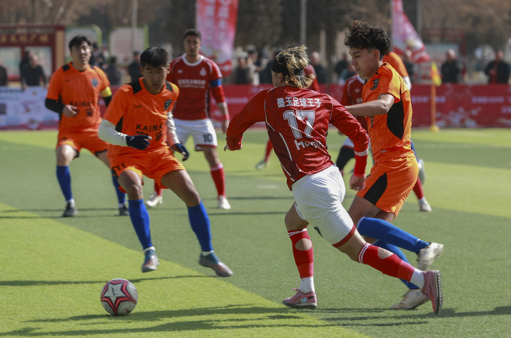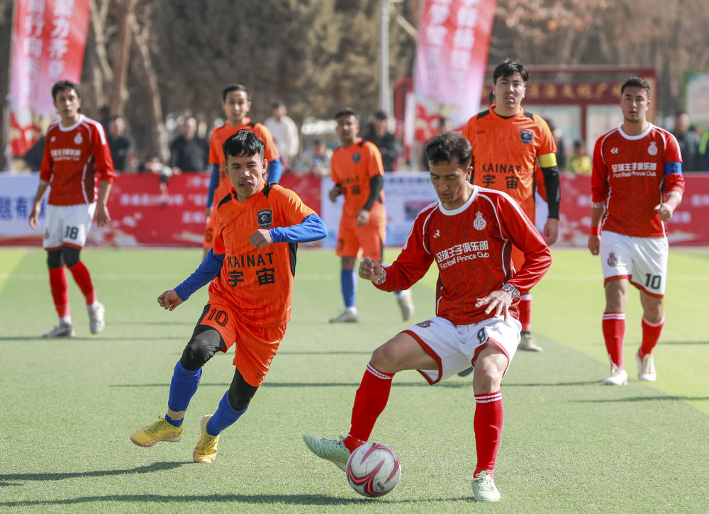 2月19日,在新疆洛浦县2026年“石榴籽·昆冈杯”新春足球友谊赛上,参赛选手正在比赛中。新华社发(买买提艾力·艾尼瓦尔 摄)