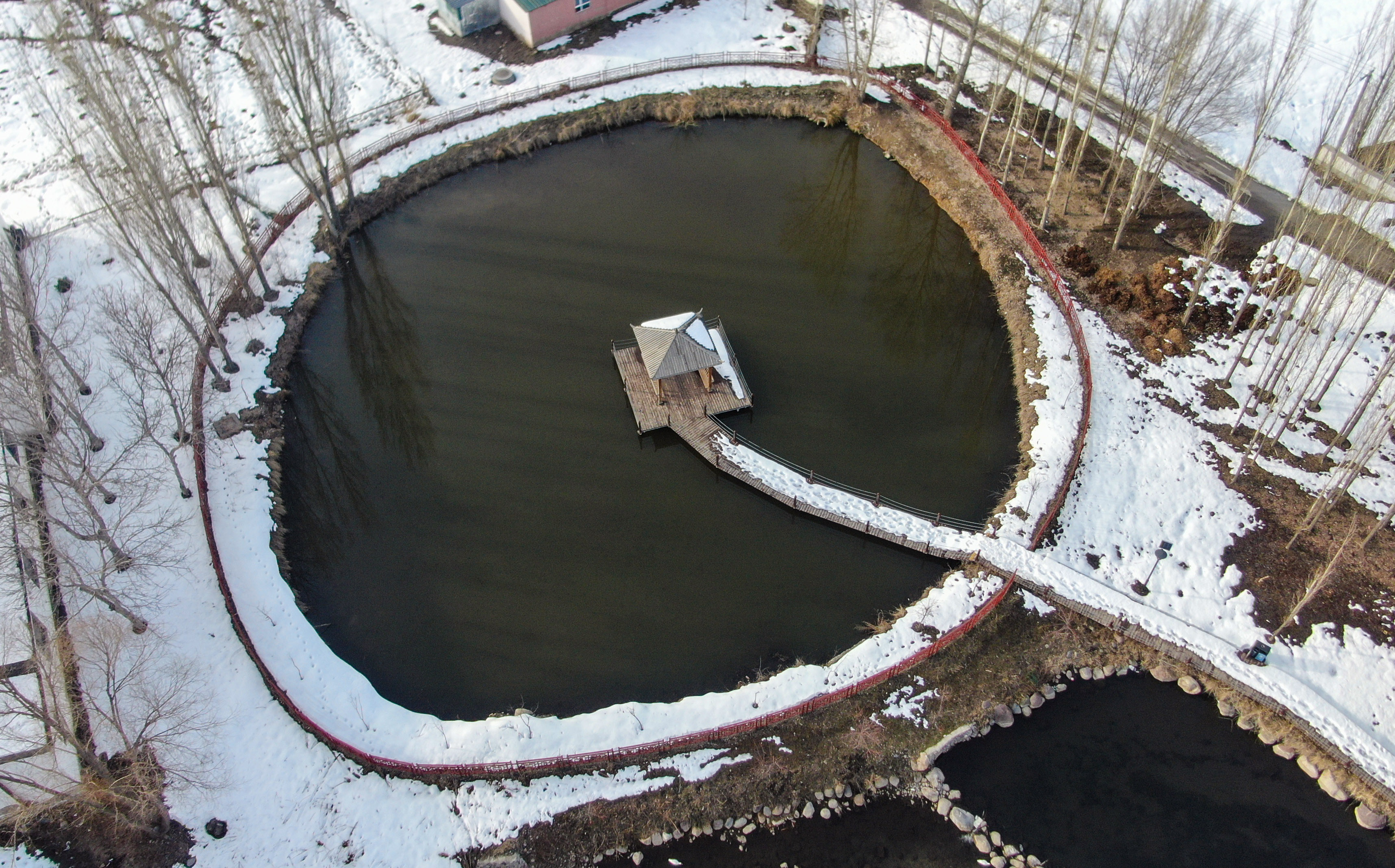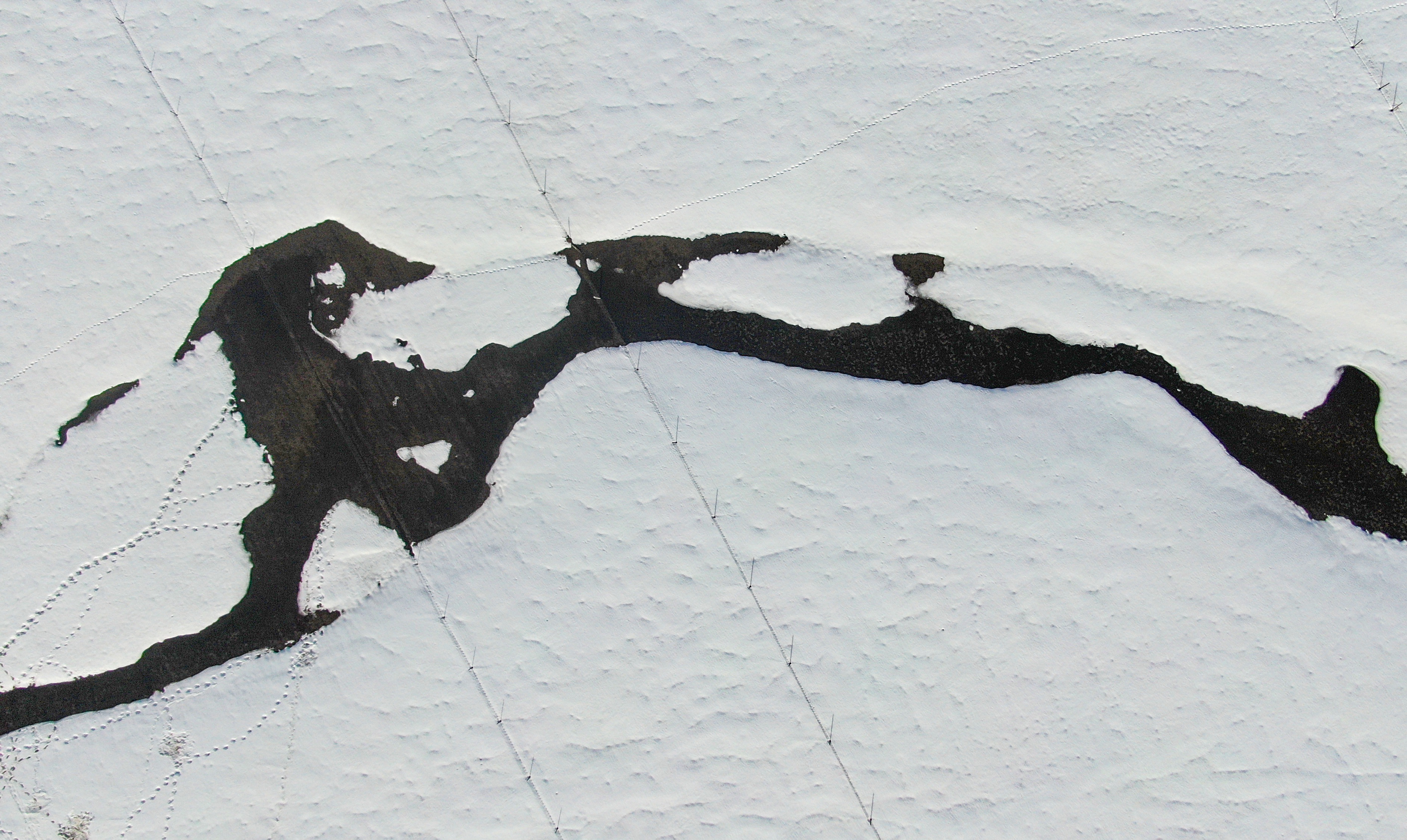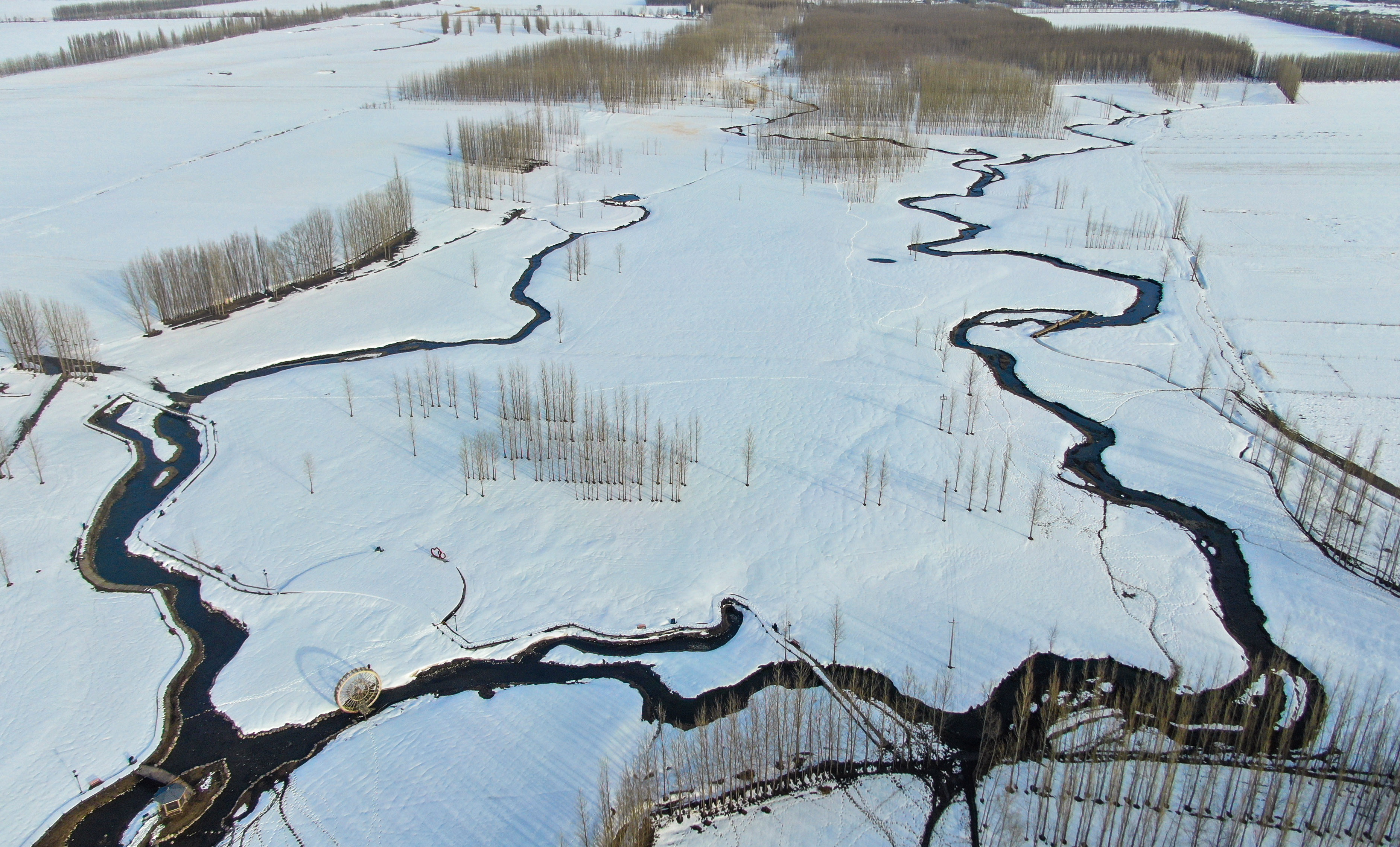 初春时节,新源县坎苏镇冰雪渐融,水系连通工程沿线迎来别样盛景。无人机高空俯瞰,融雪汇成的河流如银龙蜿蜒,在皑皑雪原上舒展身姿,千姿百态的水形,绘就出独具北疆特色的春日水韵。
