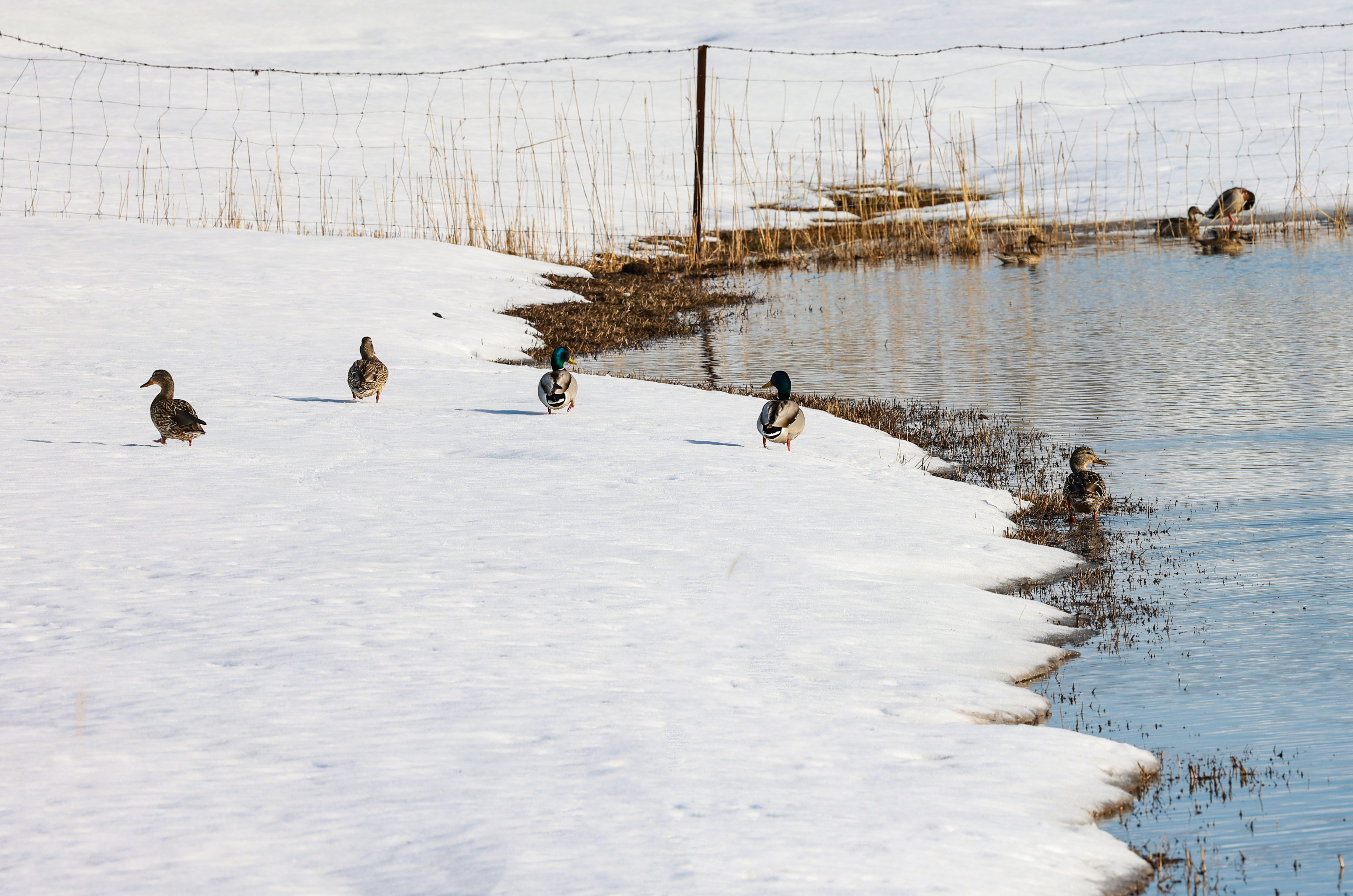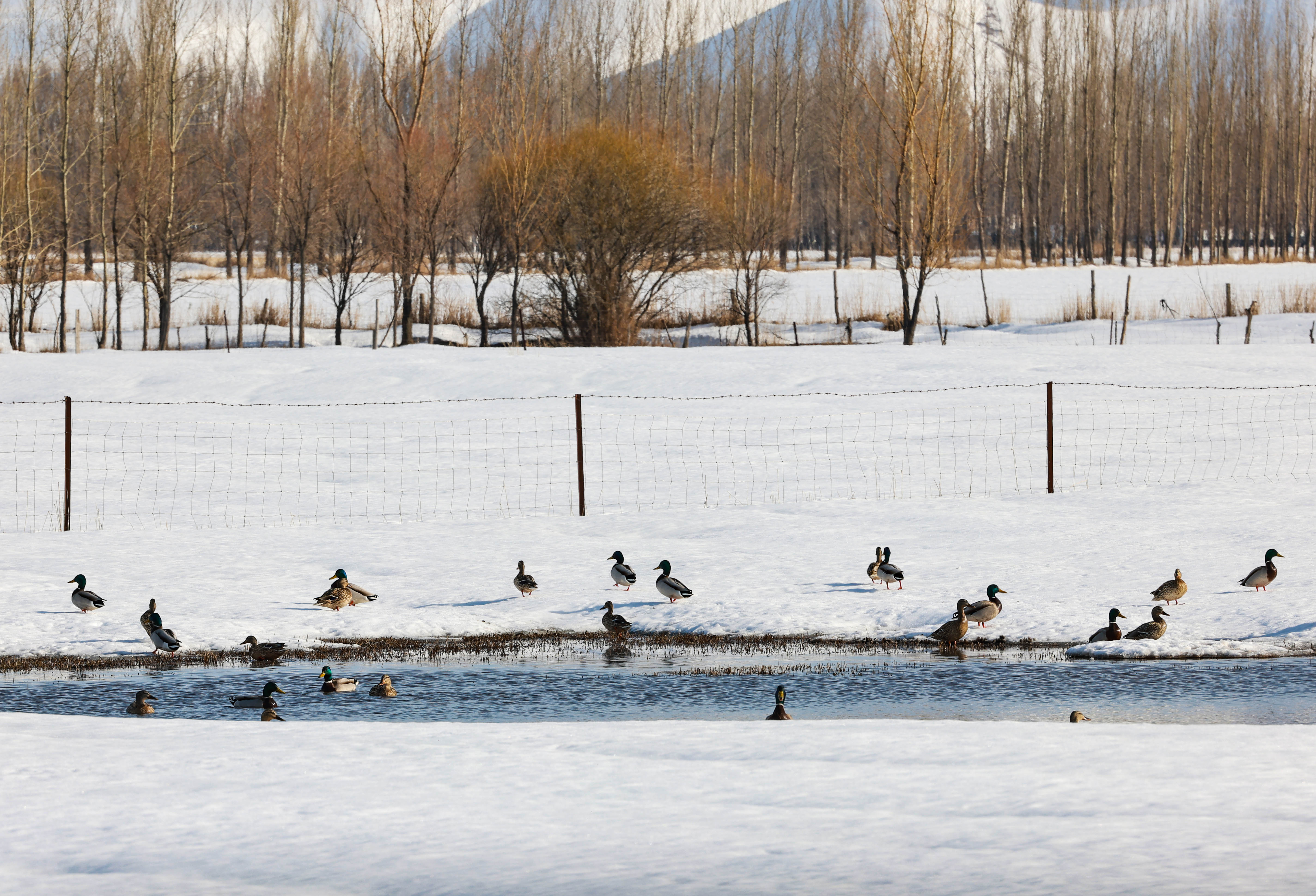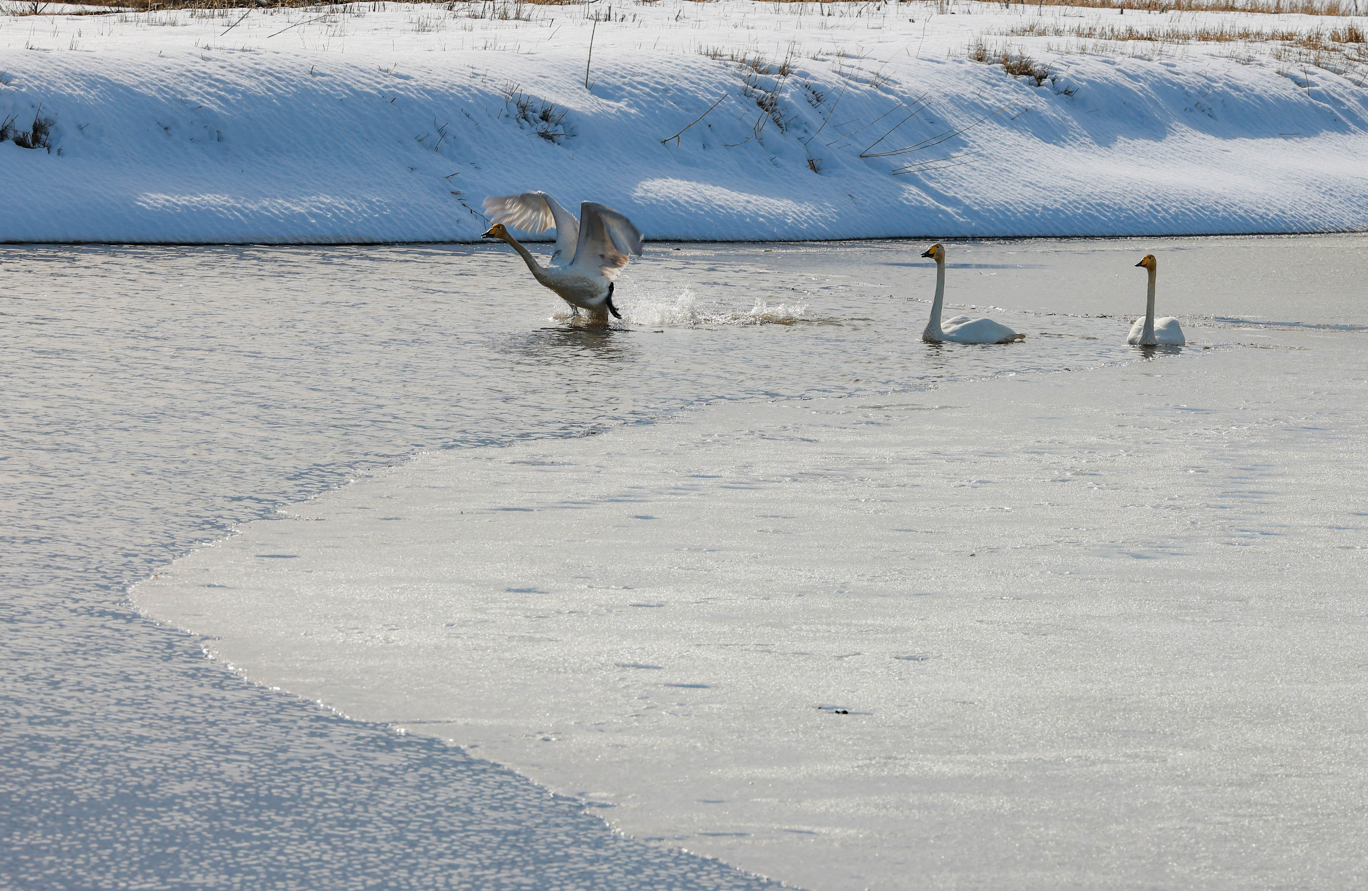 3月8日,新源县坎苏镇水系连通中,野生鸟类在水中嬉戏觅食,清脆的鸣叫声为静谧的春日增添勃勃生机。