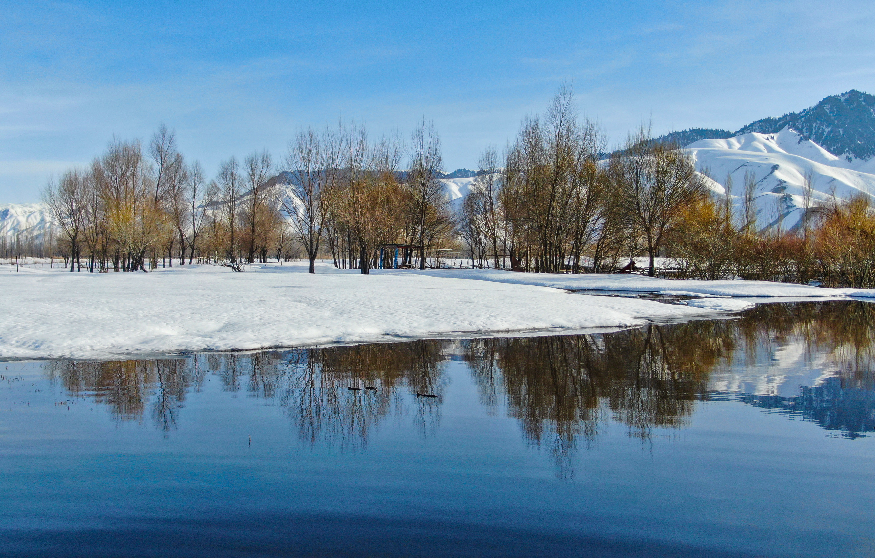 疆山如画丨银龙舞雪原 碧水映雪山 新源县坎苏镇上演初春“水中彩墨画”