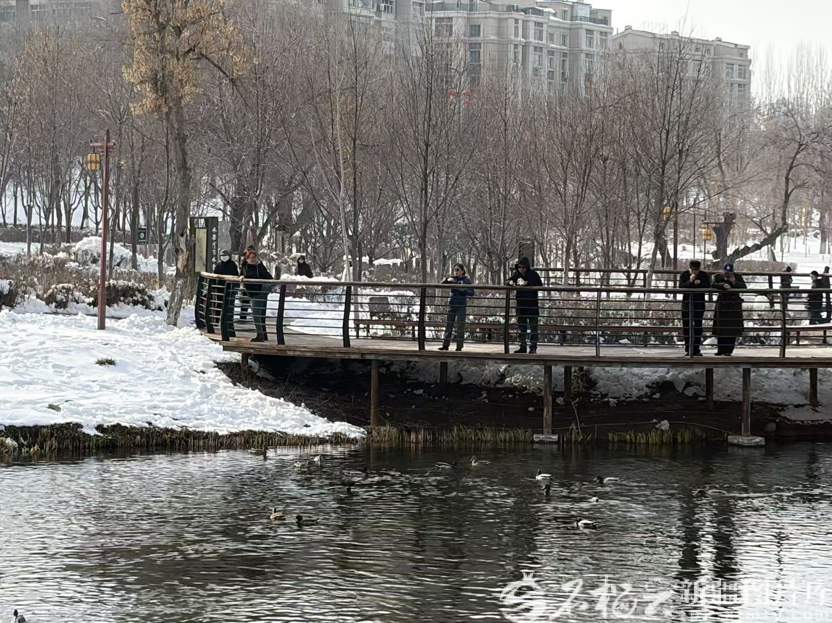 市民在乌鲁木齐市水磨河滨河景观带观赏野鸭。石榴云/新疆日报记者 姚刚摄