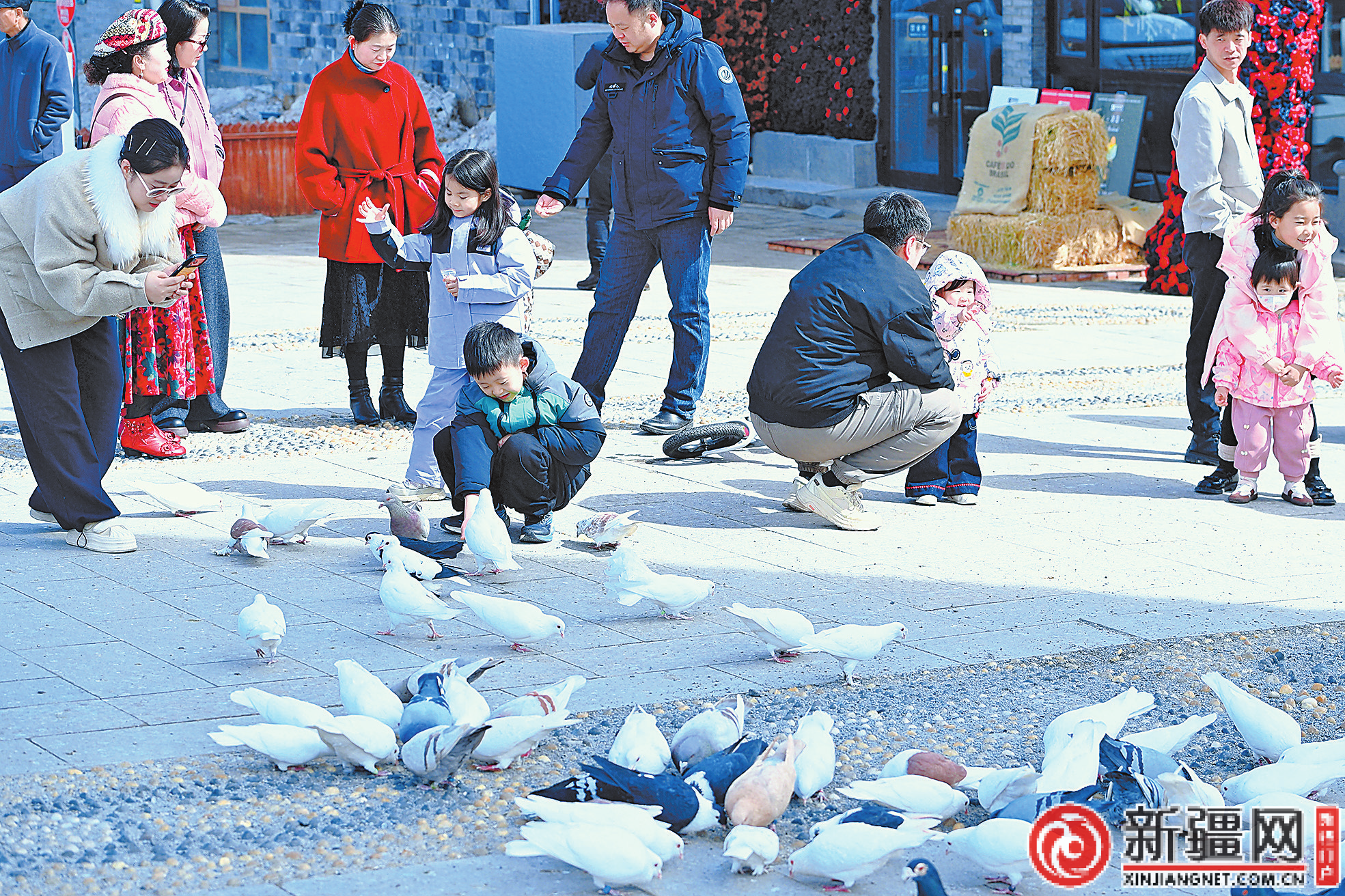3月21日,乌鲁木齐县水西沟镇的闲来小镇游人如织。图为游客在投喂鸽子。(记者陈岩摄)