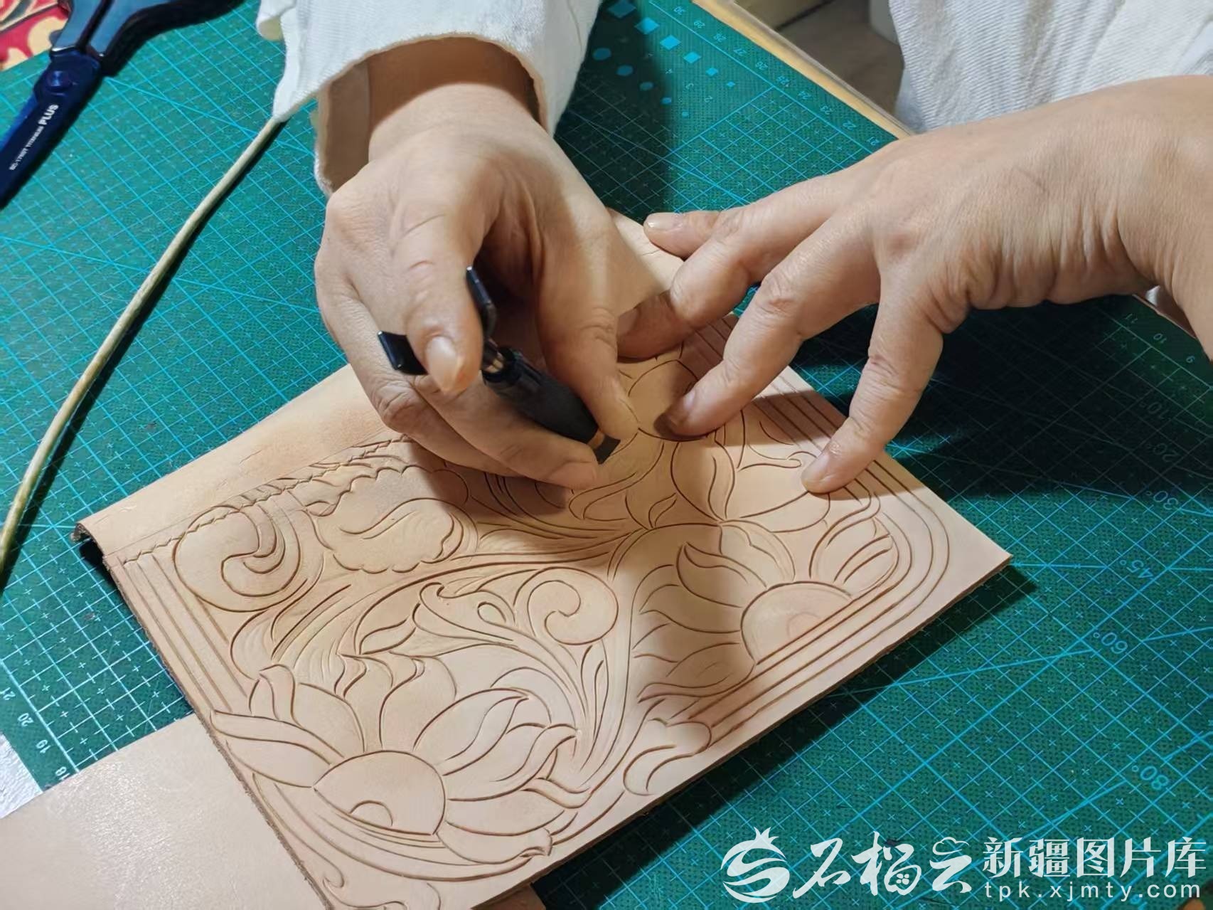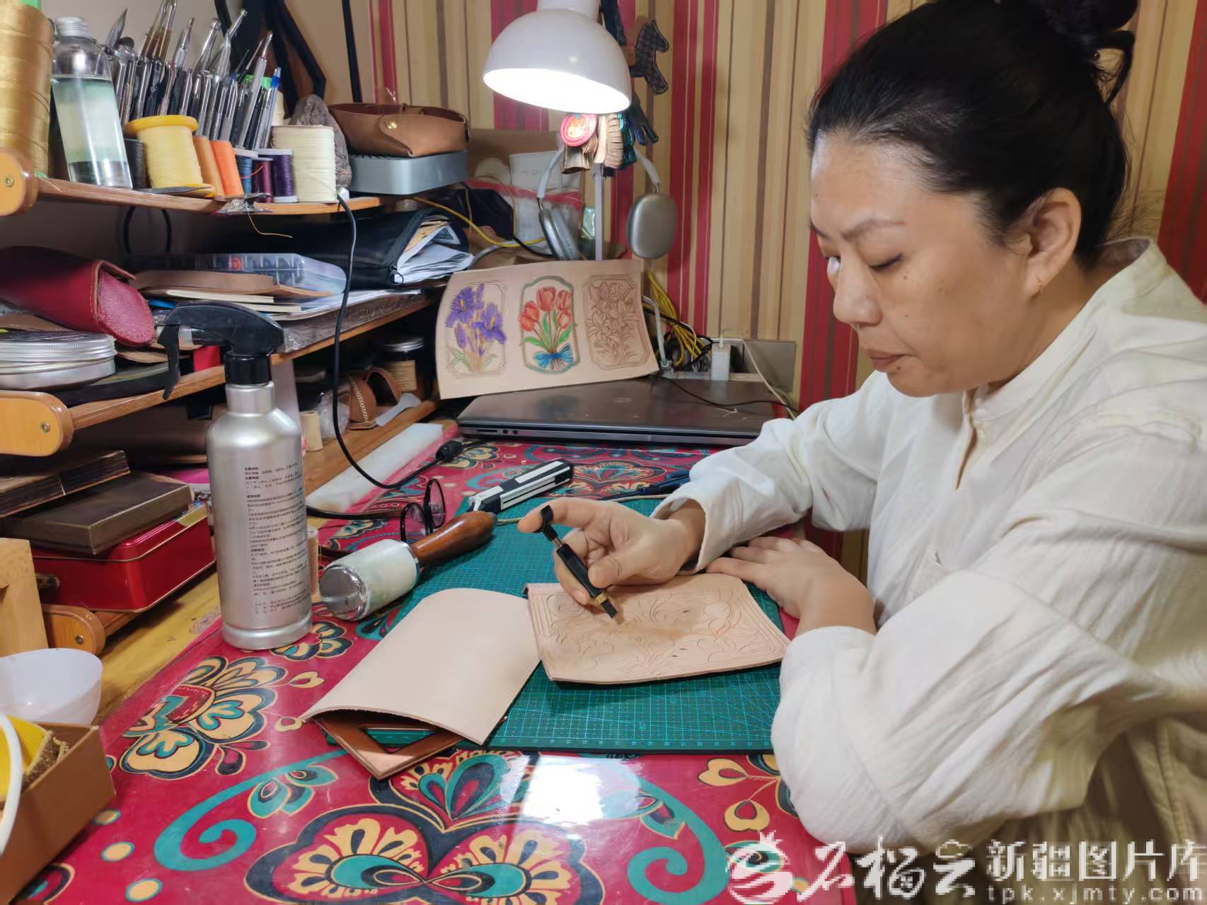 胡乃毓创作皮雕作品。石榴云/新疆日报记者 宋海波摄