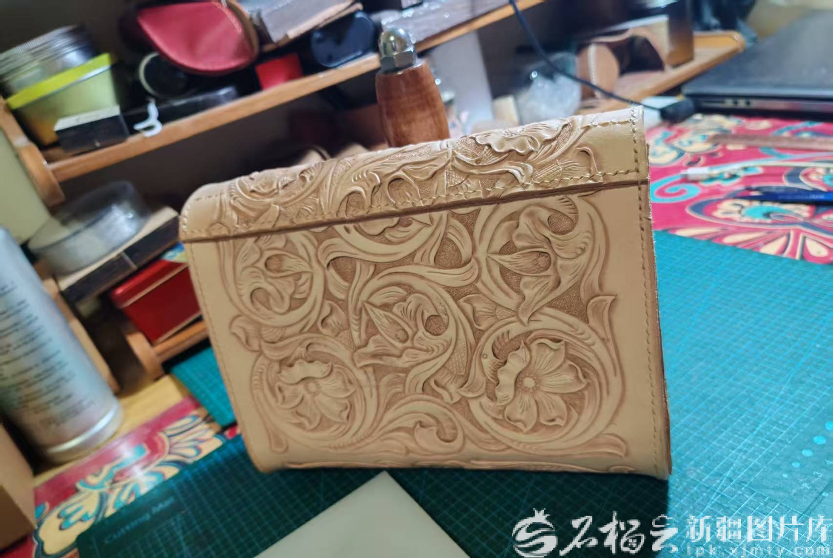 胡乃毓创作的“手包”皮雕作品。石榴云/新疆日报记者 宋海波摄