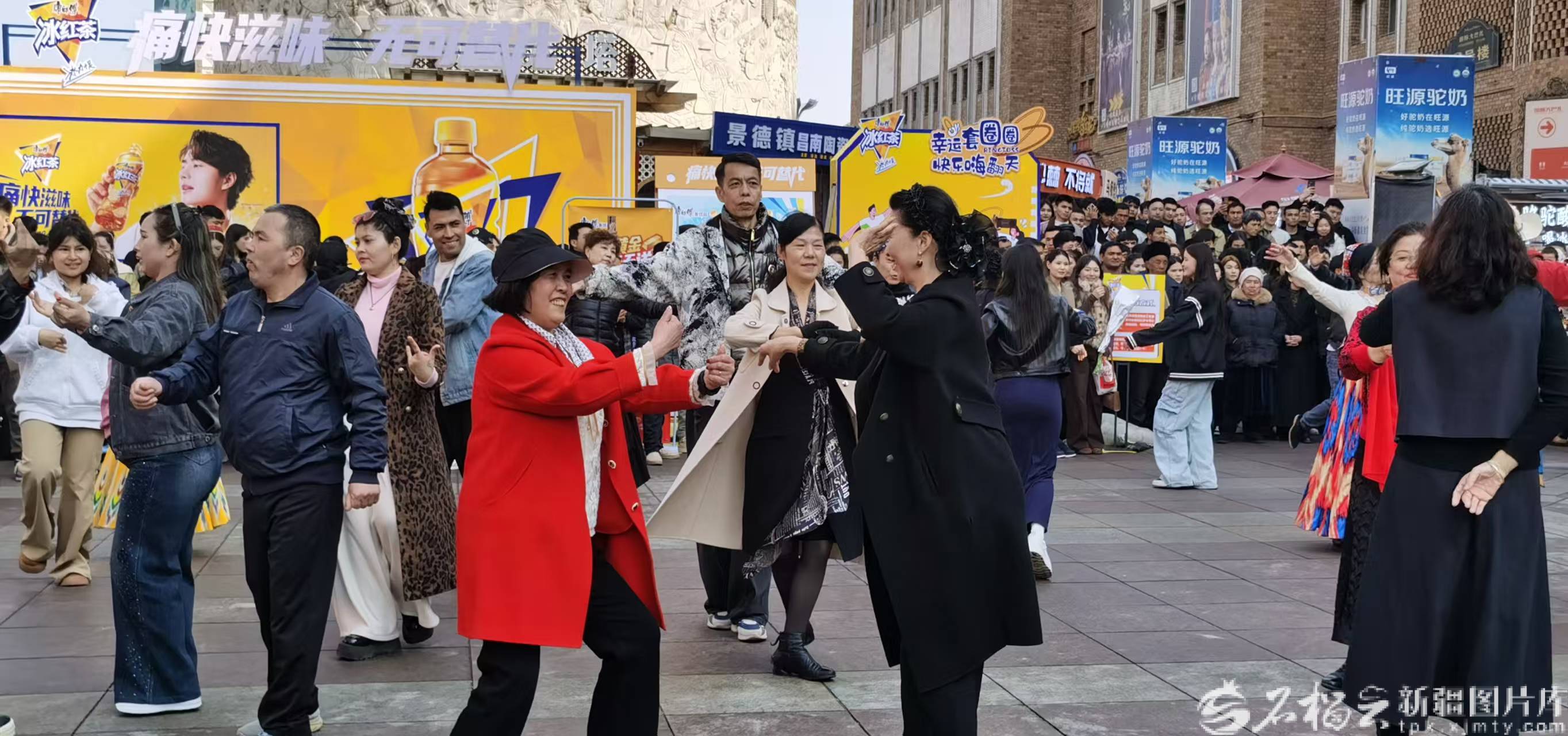 3月21日16时,随着音乐响起,三三两两的游客在这里跳起了舞蹈麦西热甫。随着越来越多的人加入其中,顿时这里成了舞蹈的海洋。