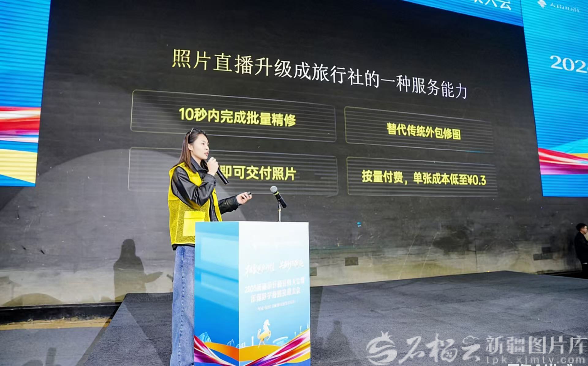 2026新疆旅行商采购大会暨新疆研学旅游发展大会上,像素芝士旅拍平台品牌负责人刘美琳正在进行推介。石榴云/新疆日报记者 阿比拜 摄