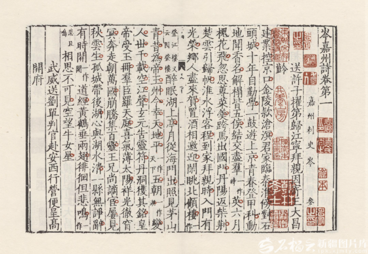 岑参诗集的首次编纂,由其友人杜确完成。杜确于唐代宗大历年间,将岑参的遗文“区分类聚,勒成八卷”。现藏于国家图书馆的宋刻本《岑嘉州诗》,是现存最早的岑参诗集版本,每半叶十行,行十八字,白口,左右双边,原书八卷,今存卷一至四。卷首有杜确撰《岑嘉州诗序》一篇,序文批判轻靡诗风、倡导讽谏比兴、推崇建安遗范,简述岑参生平,交代编纂缘由。首卷卷端题“岑嘉州诗卷之一”,次行小字署名“嘉州刺史岑参”。正文有红笔圈点。杜确为岑参编集时,便将《白雪歌送武判官归京》《热海行送崔侍御还京》《走马川行奉送出师西征》《轮台歌奉送封大夫出师西征》名篇纳入其中(列于卷一)。此本杜确序中“敦尚风格”的“敦”字缺末笔,为避南宋光宗赵惇的名讳,可知其刻于南宋光宗朝或之后。据专家考证,其版式行款、字体风格与杜审言、常建等唐代诗人的宋刻本如出一辙,推测为南宋临安府棚北睦亲坊陈起陈解元书籍铺刻本,属宋代典型的“书棚本”。此本钤印累累,见证了宋本书曲折的流传轨迹。序页、卷首尾各处钤有“庐山阳陈征印”“陈寅之印”“袁褧印”“陈崇本书画印”“东郡杨绍和彦合珍藏”“周暹”诸印,元明之际为江西庐山陈征旧藏,后为陈惟寅、袁褧所藏,袁褧为明代著名藏书家、刻书家,经其收藏后,入清经陈崇本、山东聊城杨氏海源阁藏,后为天津周叔弢收藏,最终于二十世纪五十年代捐赠国家图书馆。
