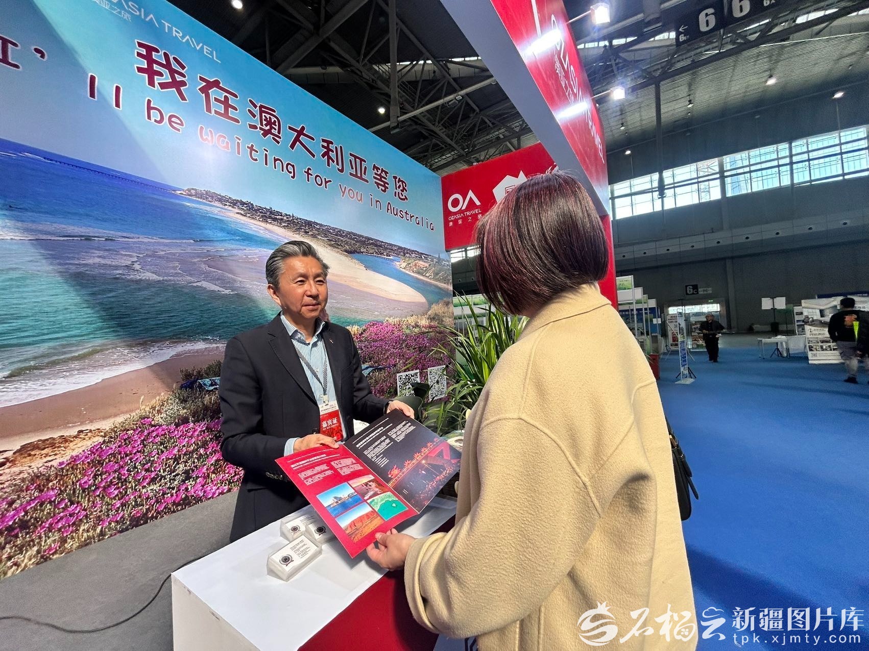 澳亚工商总会会长肖东发放澳大利亚旅游宣传材料。石榴云/新疆日报记者 张小宓摄