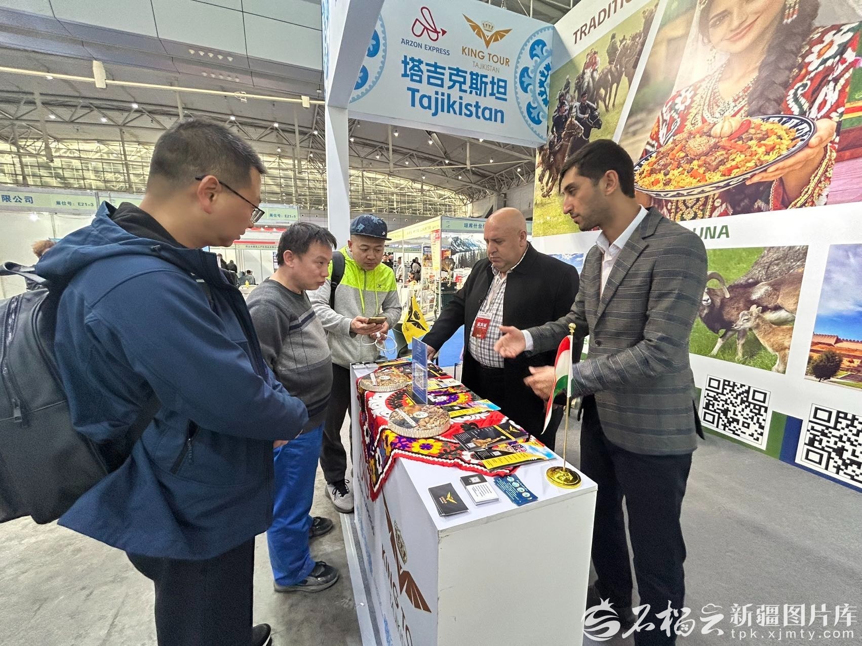 塔吉克斯坦展区,沙赫旅游公司总经理美龙(右一)正向游客介绍当地旅游资源。 石榴云/新疆日报记者 张小宓摄