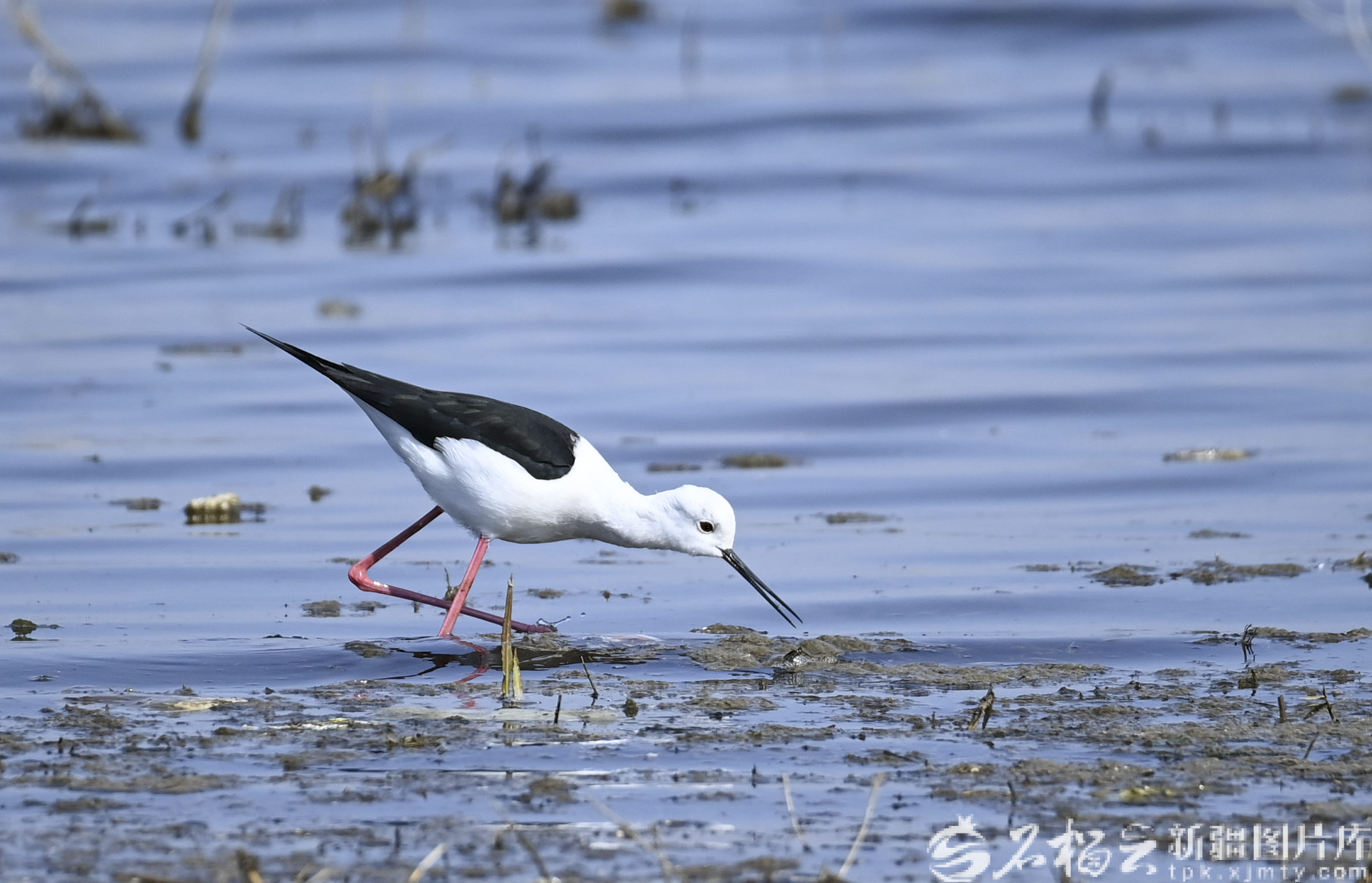 4月1日,黑翅长脚鹬在位于乌鲁木齐市米东区的猛进水库觅食。