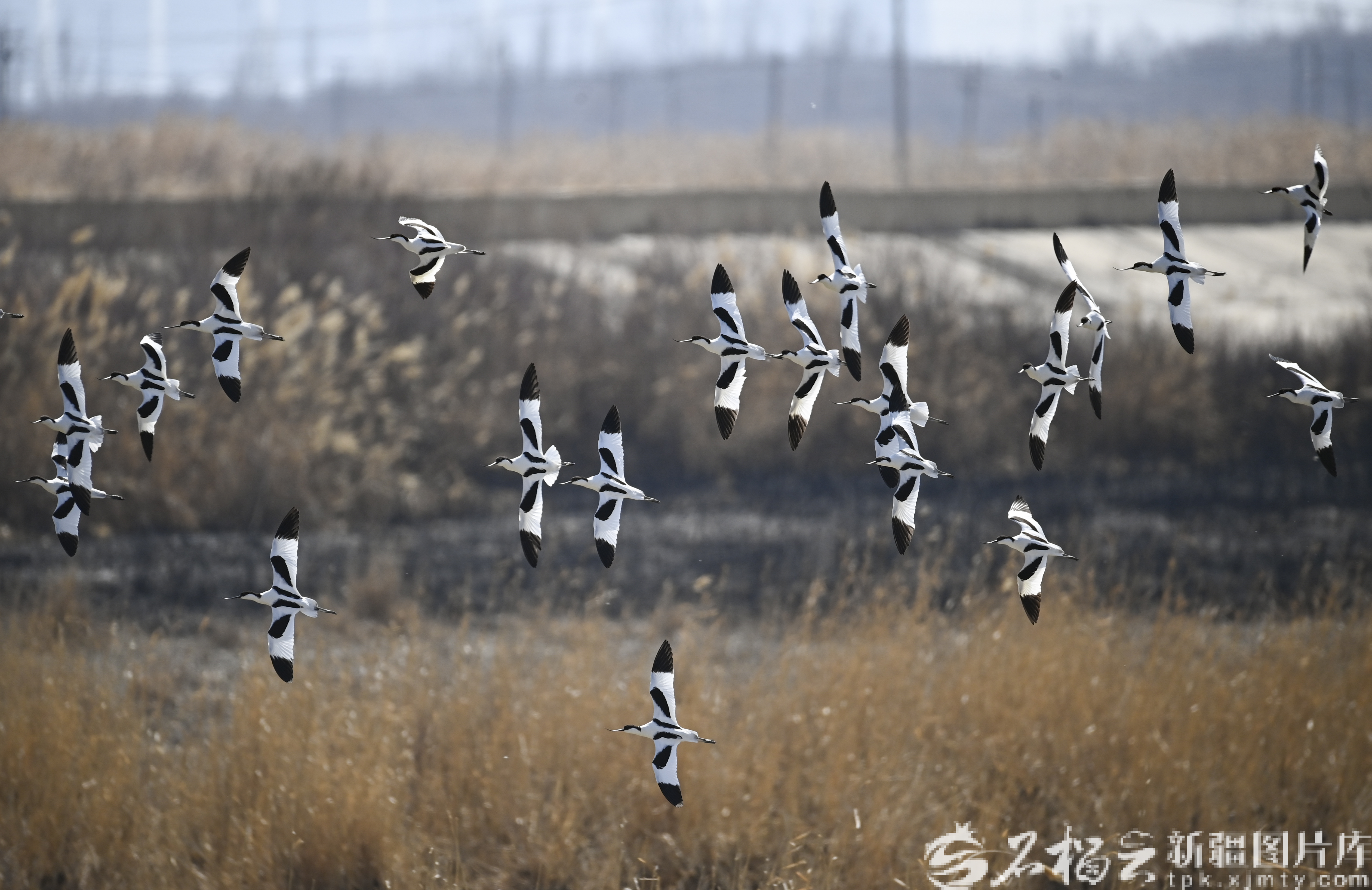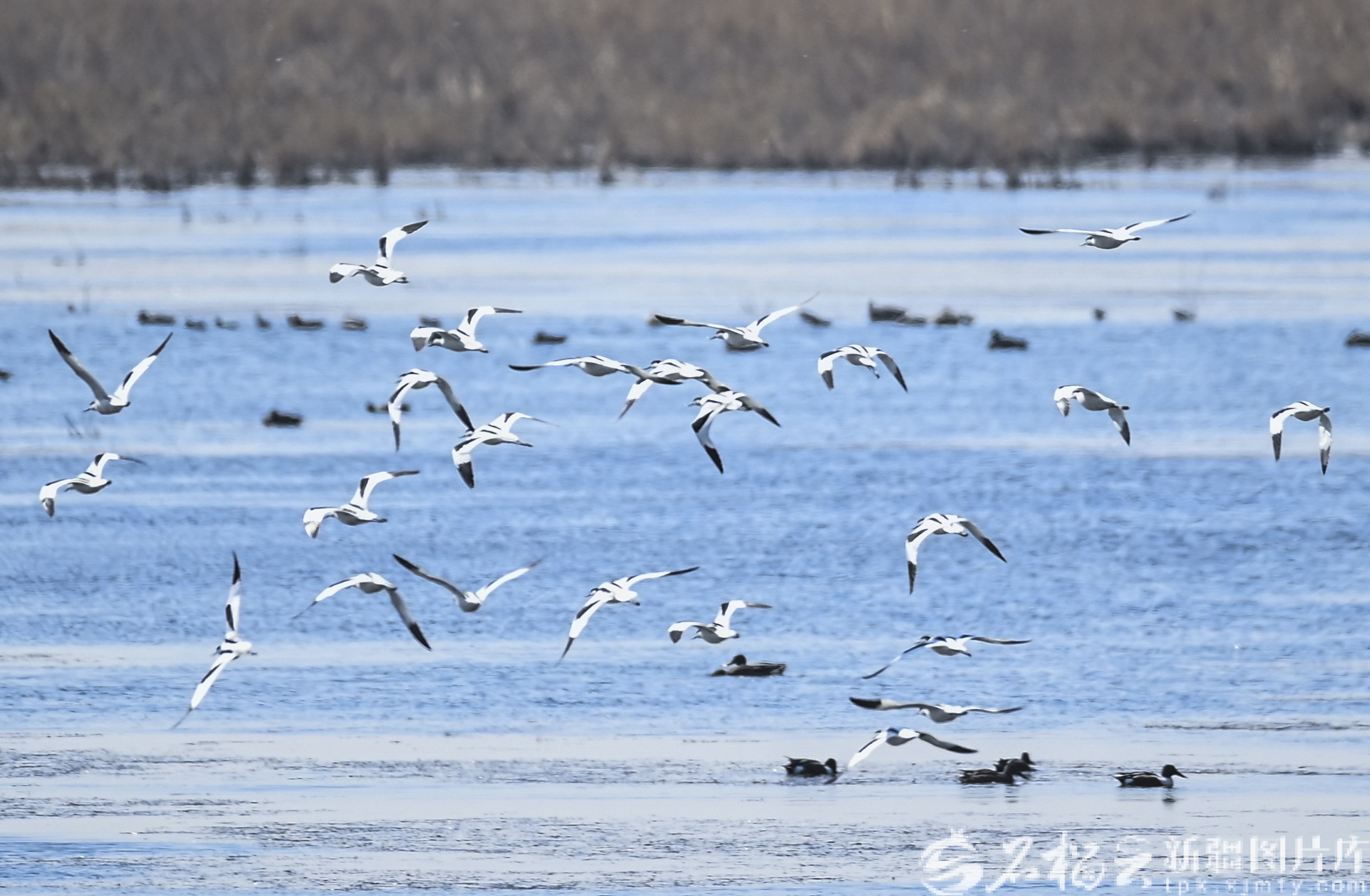 4月1日,反嘴鹬在位于乌鲁木齐市米东区的卧龙岗水库上空飞翔。