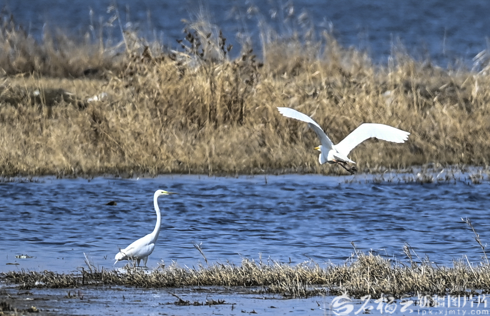 4月1日,白鹭在位于乌鲁木齐市米东区的猛进水库觅食。
