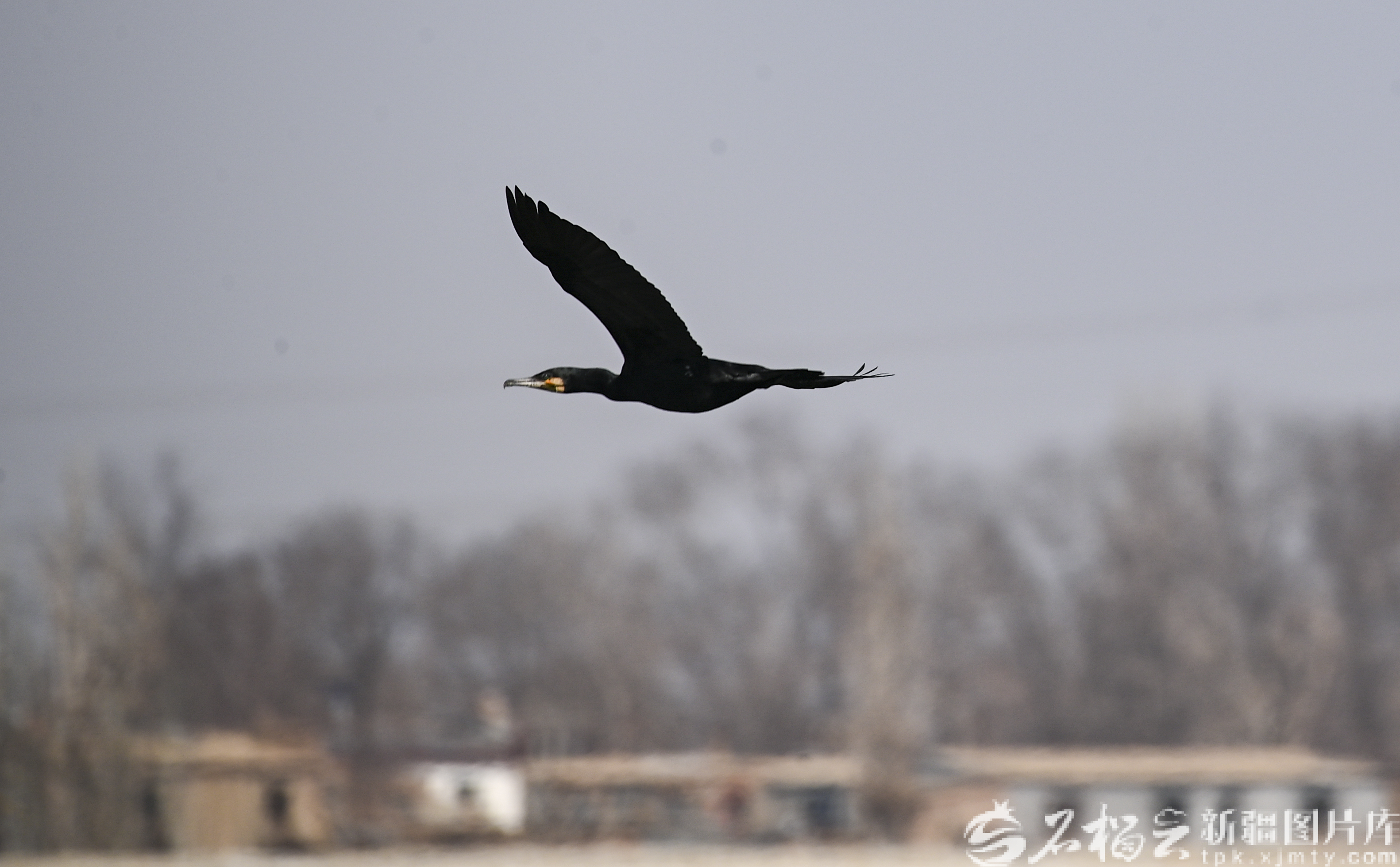 4月1日,鸬鹚在位于乌鲁木齐市米东区的塔桥湾水库上空飞翔。