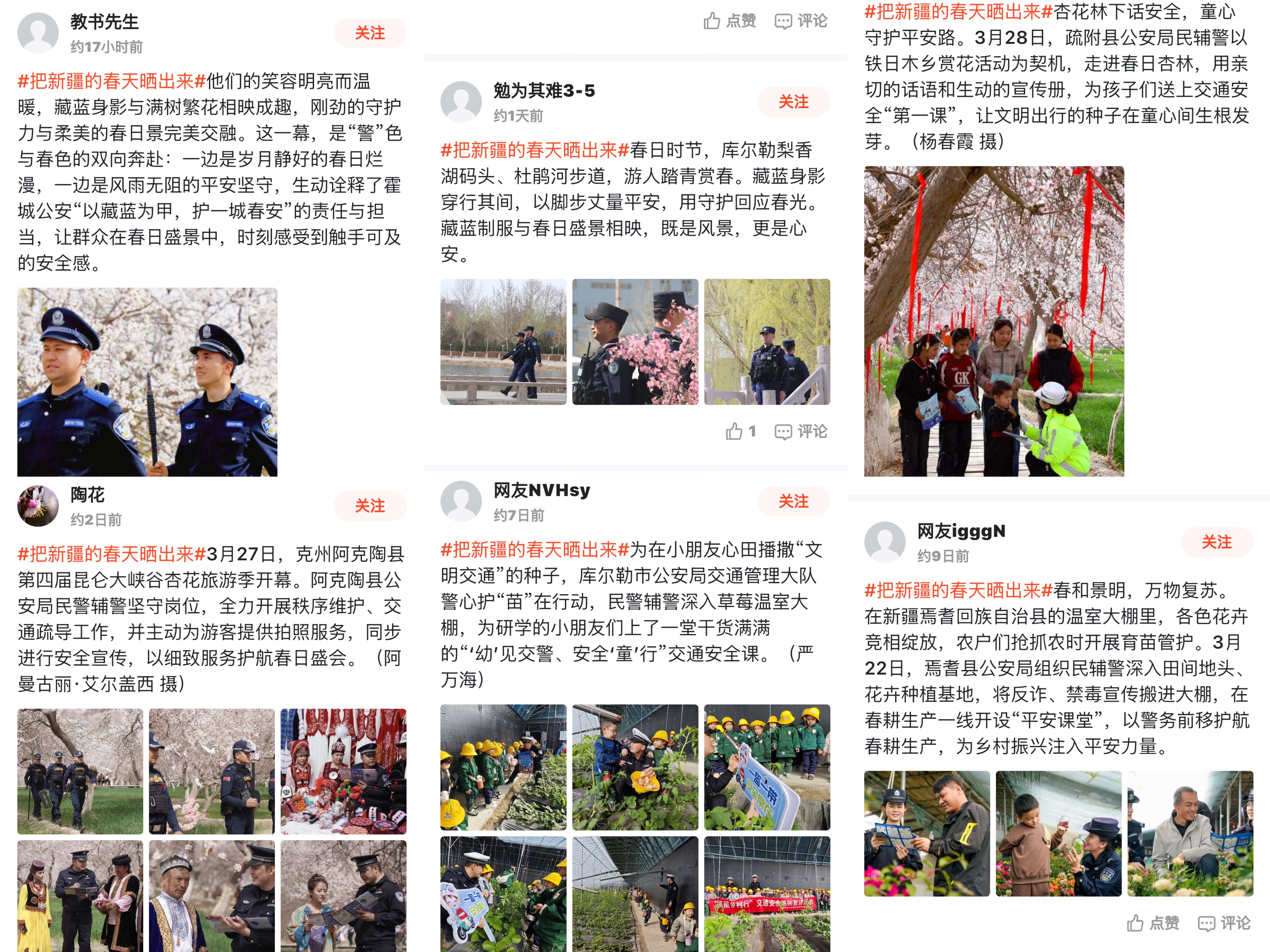 新疆的春天,不仅有自然的馈赠,更有人间的烟火与奋斗。投稿作品中,我们看到了春耕一线忙碌的身影。各地抢抓农时,田间地头机器轰鸣,播撒下丰收的希望;在绿意盎然的田野上,忙碌的不仅是辛勤的农户,还有一抹抹流动的“藏蓝”:新疆各地公安民辅警紧跟农时,以“田间警务”在春耕图景中绘就了“警民同心”动人画卷。