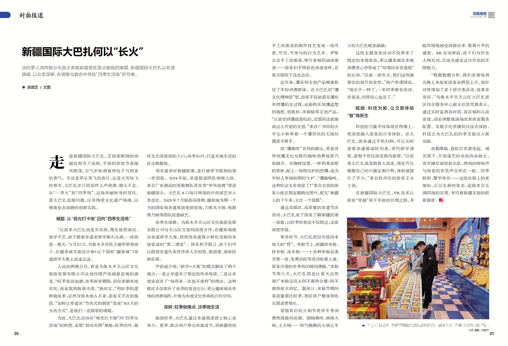 走进新疆国际大巴扎,艾德莱斯绸的绚丽在阳光下流转,手鼓的欢快节奏随风飘荡,空气中弥漫着烤包子与奶茶的香气。无论是草长莺飞的春日,还是大雪纷飞的寒冬,大巴扎步行街始终人声鼎沸、烟火不息。从“一季火”到“四季热”,这场华丽转身的背后,是大巴扎直面问题,以非物质文化遗产铸魂、以精准业态深耕的创新实践。