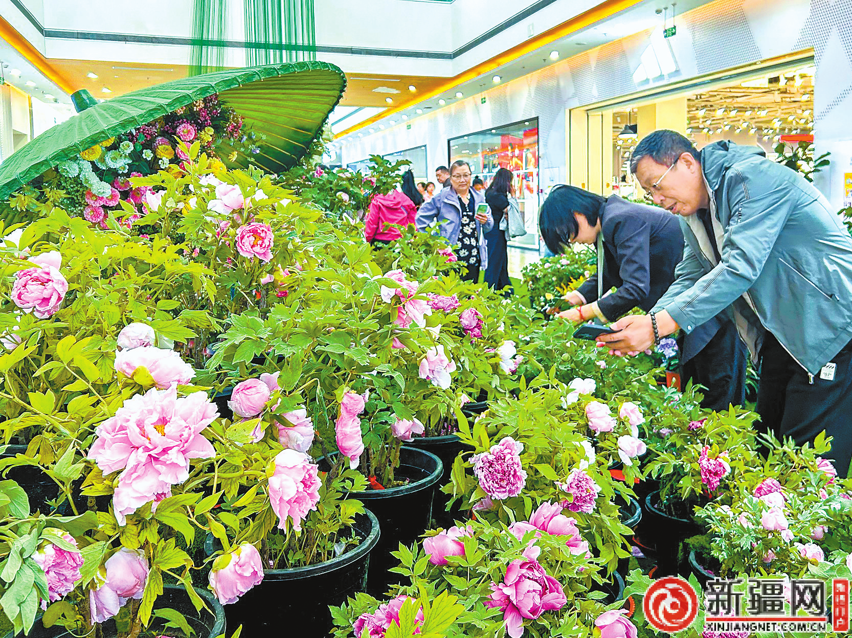4月11日,200多盆、1000多株从洛阳远道而来的精品牡丹在乌鲁木齐杉杉奥特莱斯广场竞相盛放,吸引市民观看。(记者牟敏摄)