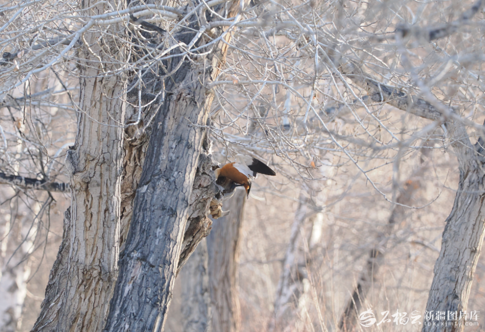 4月6日,新疆鸟友在布尔津县拍鸟时,偶遇一只赤麻鸭飞到了树上。袁俊萍 摄