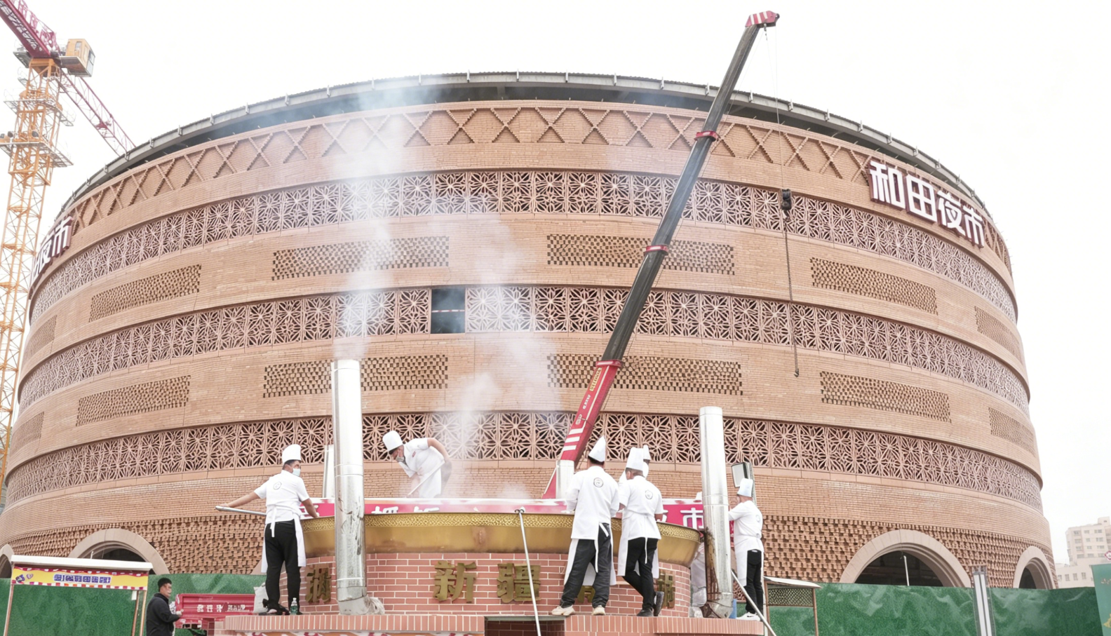 亮相的“新疆第一锅”直径达6米,深1.3米,周长18.8米,单次最大可制作2万份抓饭。当天清晨7时,20余名厨师就开始准备食材,历经7小时炖煮,抓饭出炉。