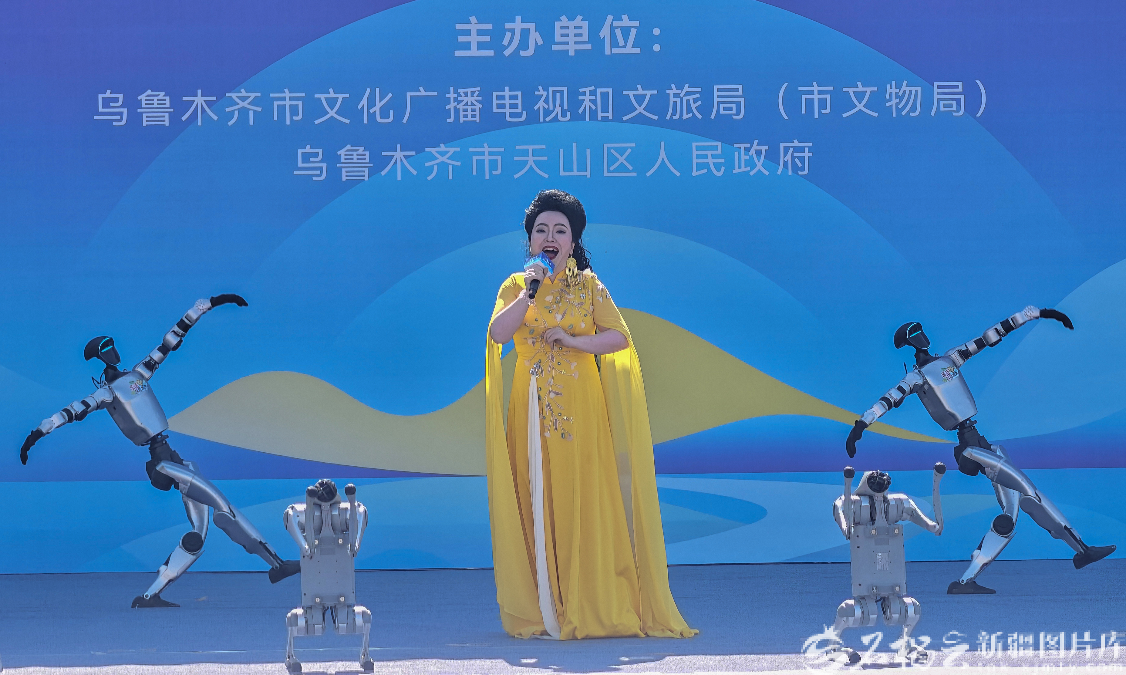 4月19日,演员与机器人表演歌舞。