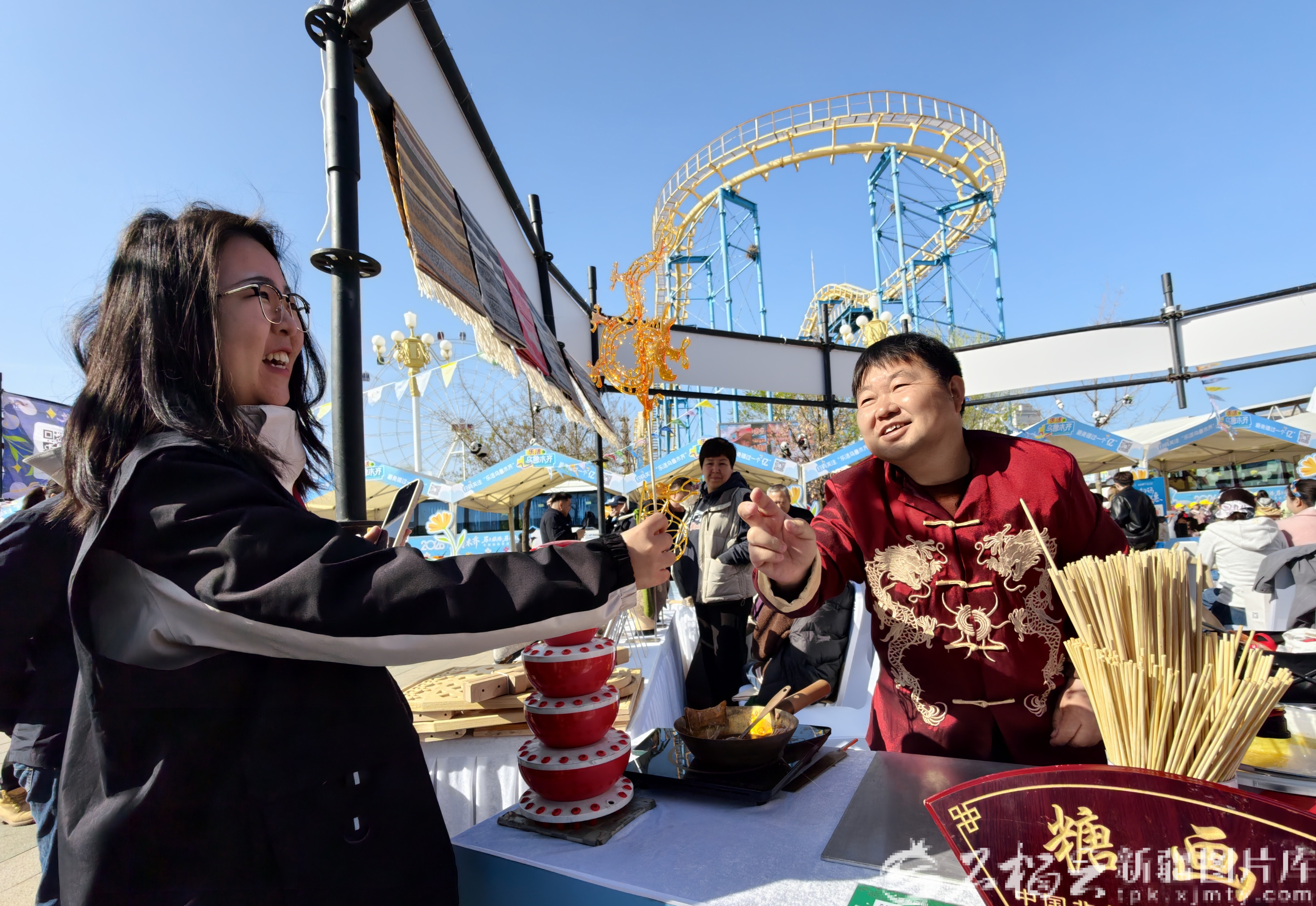 4月19日,游客在乌鲁木齐好物专区购买糖画。