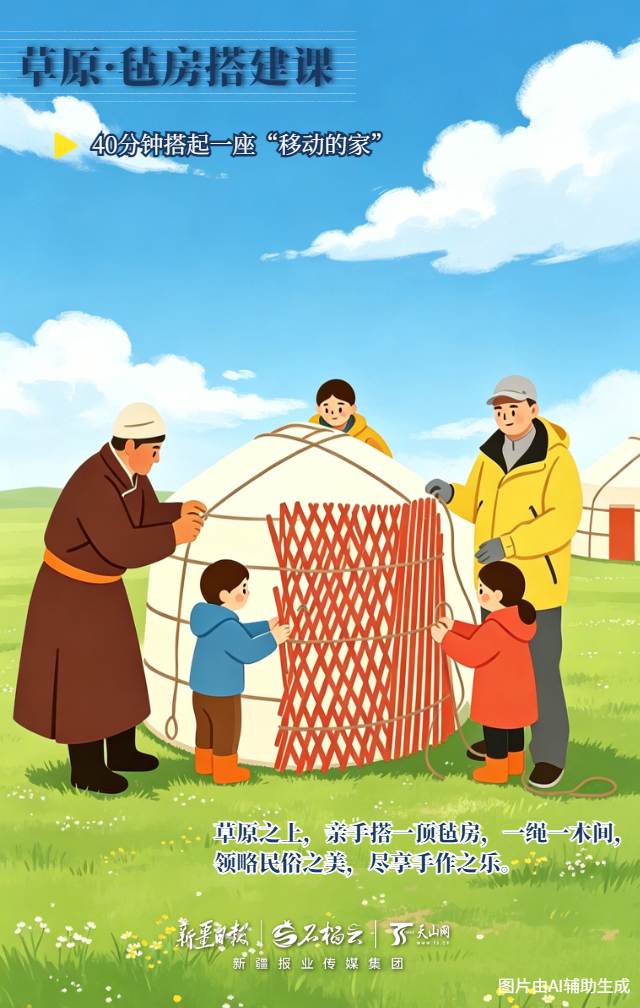 在草原上亲手搭建一顶毡房,到沙漠里扎下守护绿洲的草方格,于田间地头体验农耕的辛劳与喜悦,走进工厂触摸科技的脉动与未来……新疆的研学之旅,早已不止于“看风景”,更是一场“悟文化、学知识、强实践”的深度探索。让我们透过这组海报,走进这间没有围墙的“行走课堂”,感受新疆中小学生研学旅游的独特魅力。
