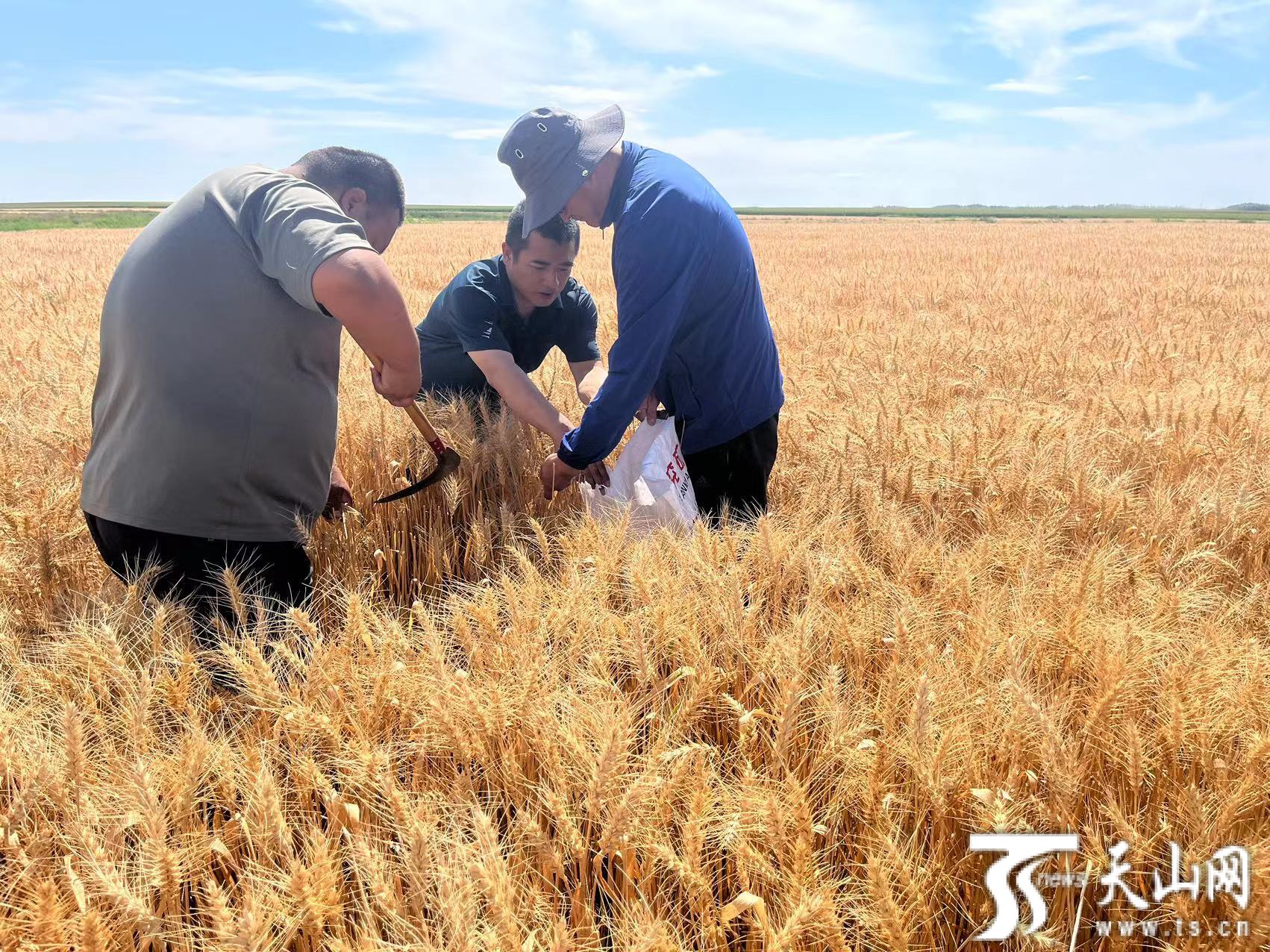 阿勒泰市农技人员对不同地块的春小麦长势、亩穗数、穗粒数、千粒重等进行科学抽样测产调查。
