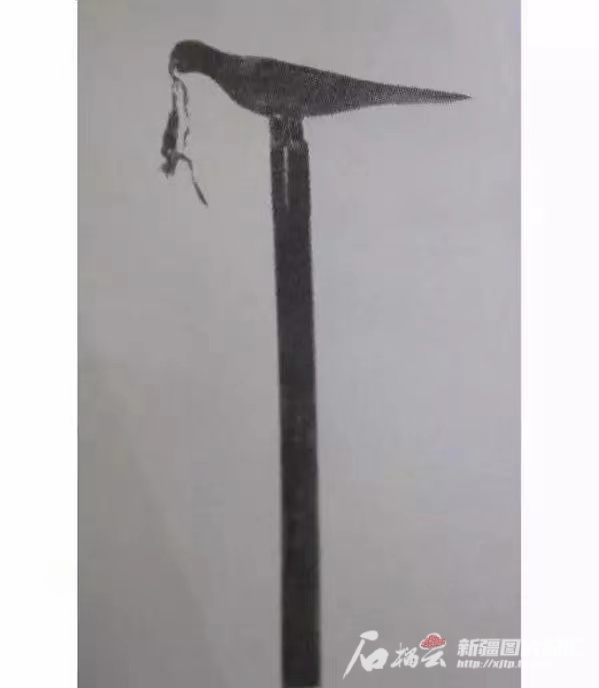 这把鸠杖现馆藏于自治区博物馆,年代为北朝至唐代,通体黑色,长达1.74米,杖头是一只雕刻精细的斑鸠鸟,身涂少许红色,口衔红绶带。