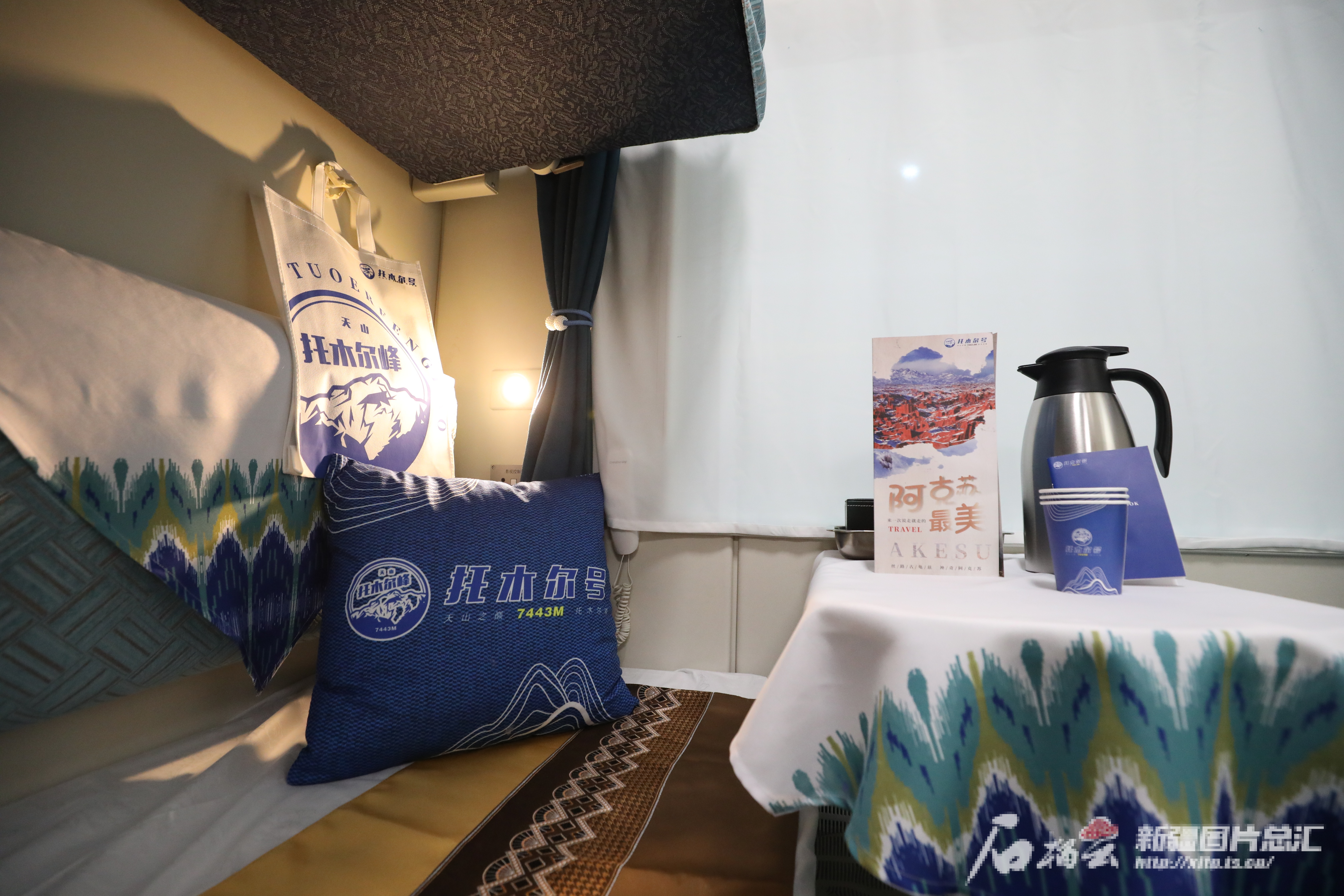 车厢内部细节装饰别出心裁,车厢通道铺设有柔软且具有特色的地毯,每节车厢板壁及软卧房间里悬挂有独库公路、天山托木尔、克孜尔红石林等众多阿克苏当地的人文风光以及著名景区、特色瓜果精美图片并配有详尽介绍,成为旅客了解新疆、了解阿克苏的一个“窗口”。