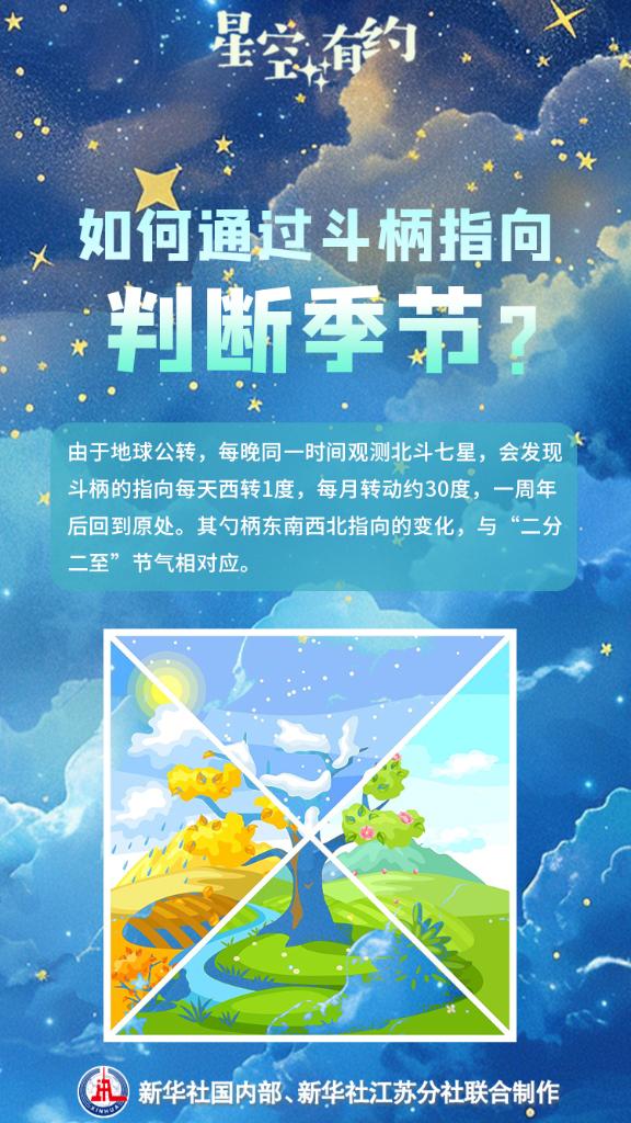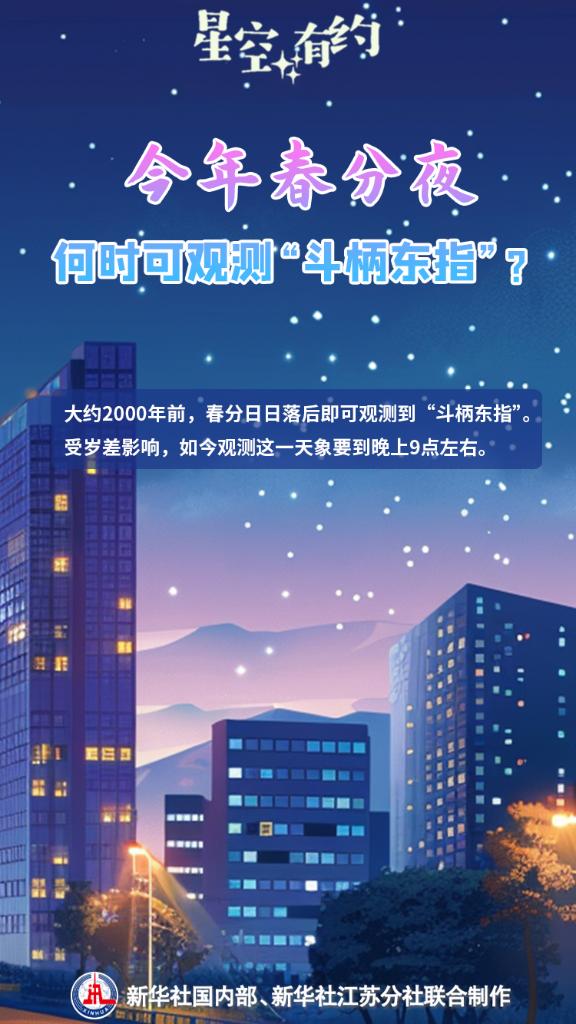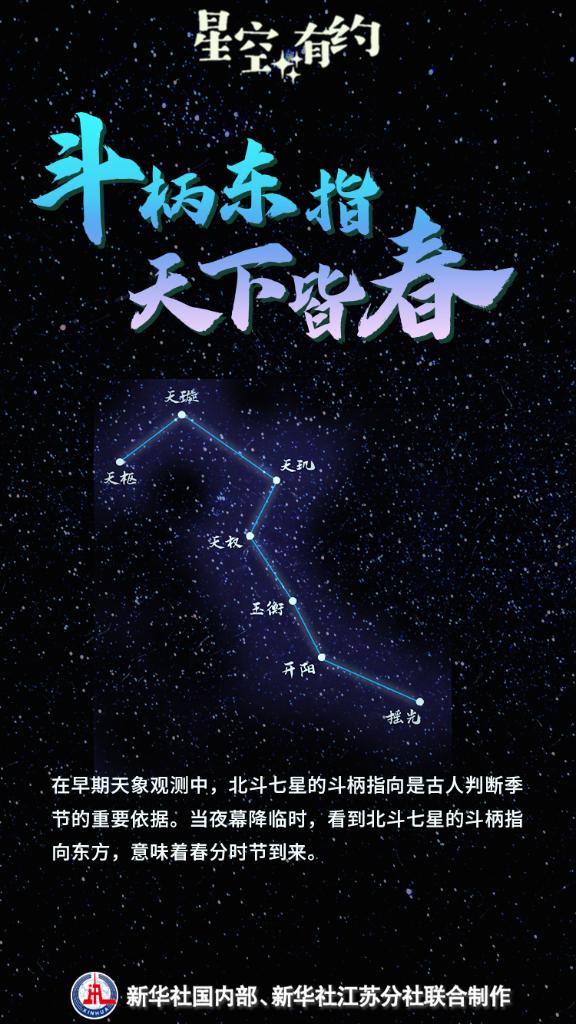 新华社南京3月19日电(记者王珏玢、朱筱)3月20日将迎来春分节气。这一时节草长莺飞、花满枝头,天上的星斗也指示着春天的到来。我国古代有“斗柄东指,天下皆春”的说法,意思是当夜幕降临时,看到北斗七星的斗柄指向东方,意味着春分时节到来。
