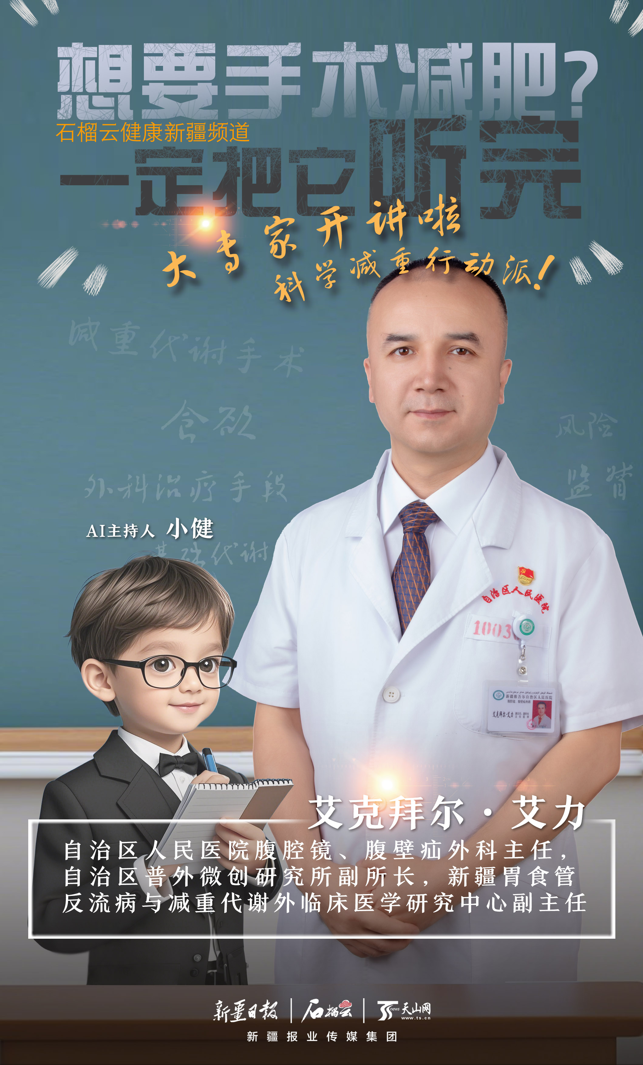 今天,我们非常荣幸邀请到了新疆减重代谢手术领域的专家——自治区人民医院腹腔镜、腹壁疝外科艾克拜尔·艾力主任,为大家详细讲解减重代谢手术。希望通过今天的节目,能帮助大家更科学地认识减重代谢手术,找到适合自己的健康管理方式。