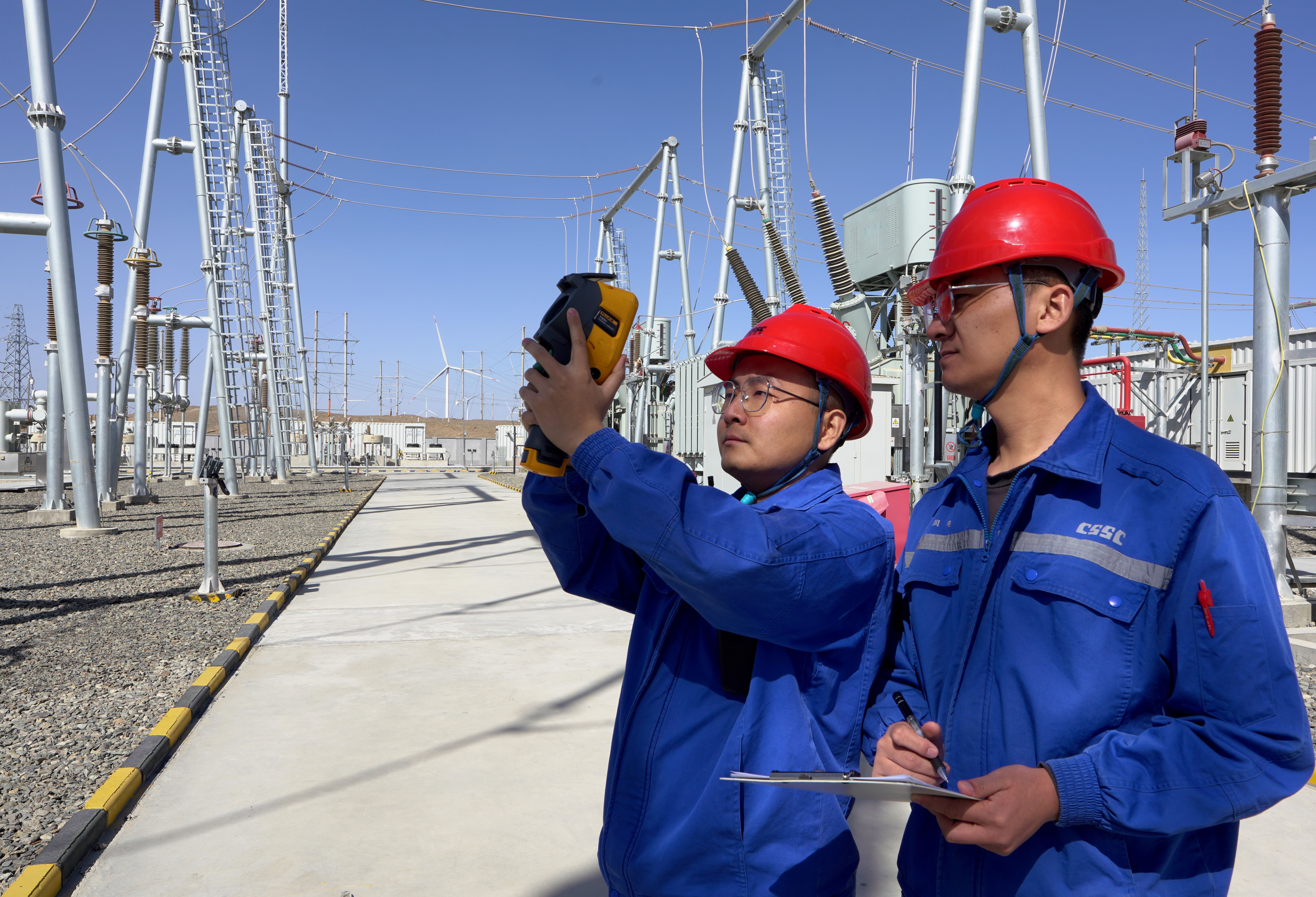 在中船集团十三间房百万千瓦风电场,工作人员正在测量设备运行温度。新华社记者张啸诚 摄
