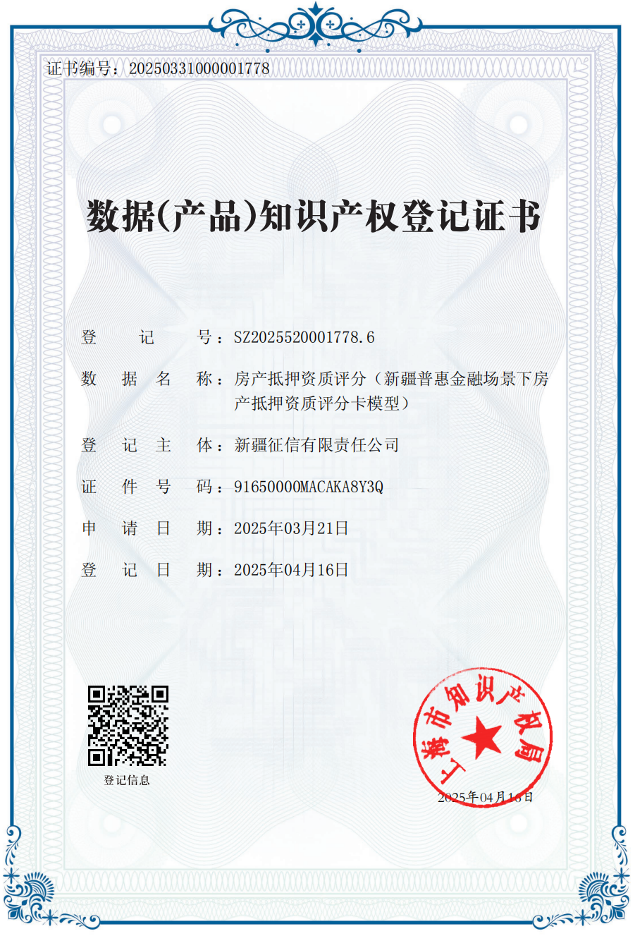 石榴云/新疆日报讯(记者 石鑫报道)4月28日,新疆征信有限责任公司传来喜讯:其自主研发的 “房产抵押资质评分”数据产品正式通过上海市知识产权局审查公示,成功拿下新疆首张数据(产品)知识产权登记证书,标志着新疆在数据要素价值转化与知识产权保护领域迈出关键一步。