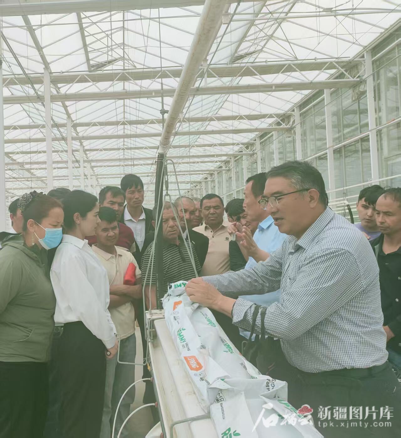 5月10日,学员们参观智能温室,疏勒县水发现代农业技术培训学校教师给大家讲解无土栽培种植技术。石榴云/新疆日报记者 加孜拉·泥斯拜克摄