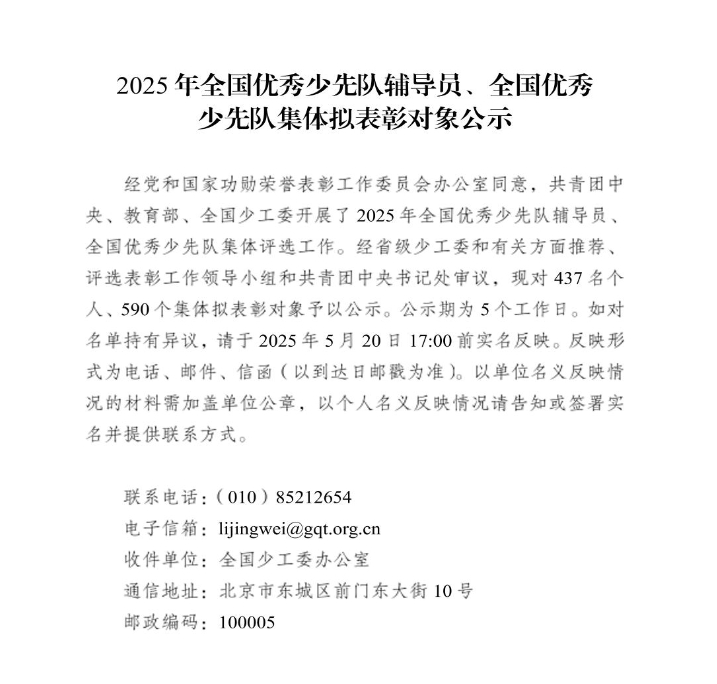 经党和国家功勋荣誉表彰工作委员会办公室同意,共青团中央、教育部、全国少工委开展了2025年全国优秀少先队辅导员、全国优秀少先队集体评选工作。经省级少工委和有关方面推荐、评选表彰工作领导小组和共青团中央书记处审议,现对437名个人、590个集体拟表彰对象予以公示。公示期为5个工作日。如对名单持有异议,请于2025年5月20日17:00前实名反映。反映形式为电话、邮件、信函(以到达日邮戳为准)。以单位名义反映情况的材料需加盖单位公章,以个人名义反映情况请告知或签署实名并提供联系方式。