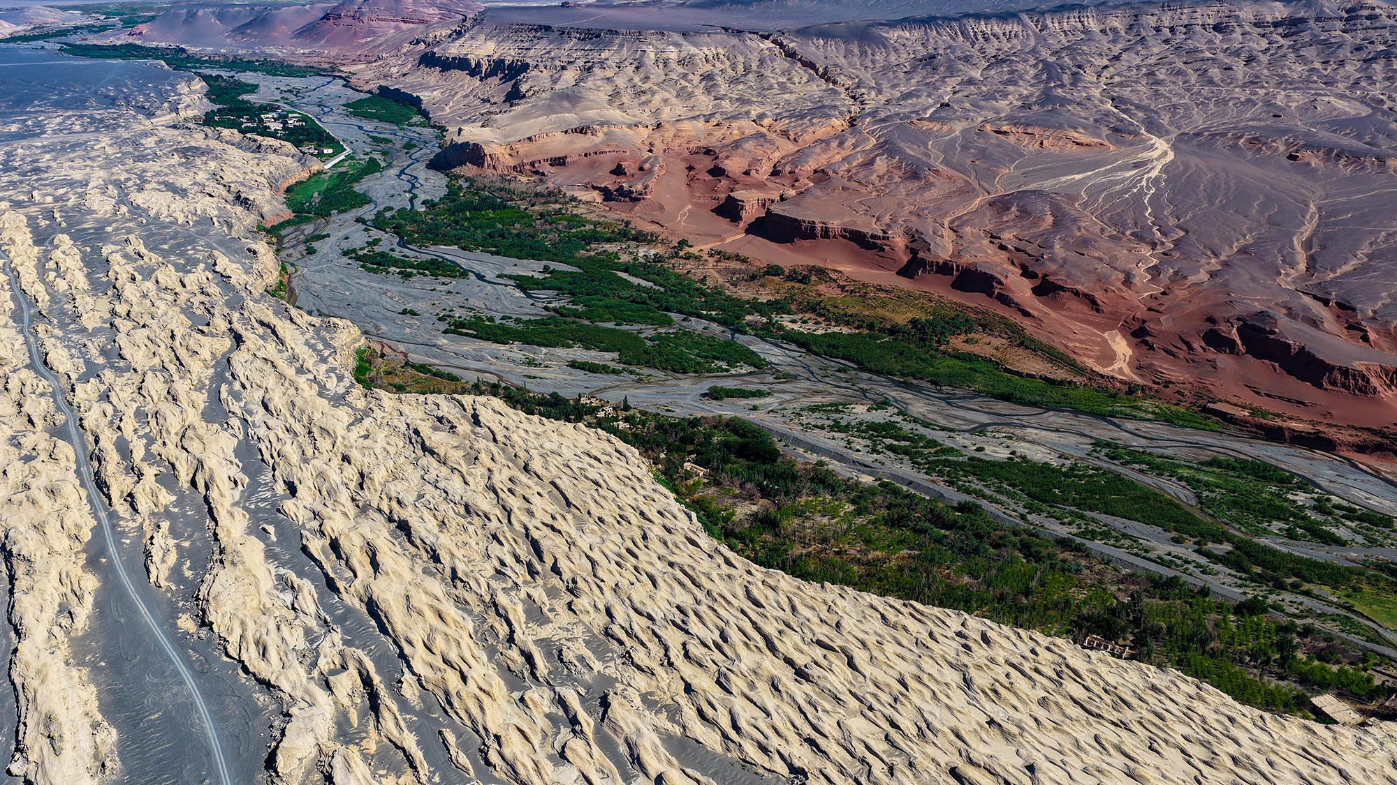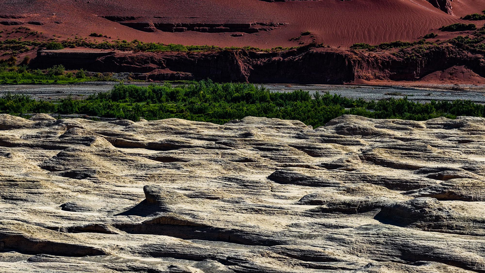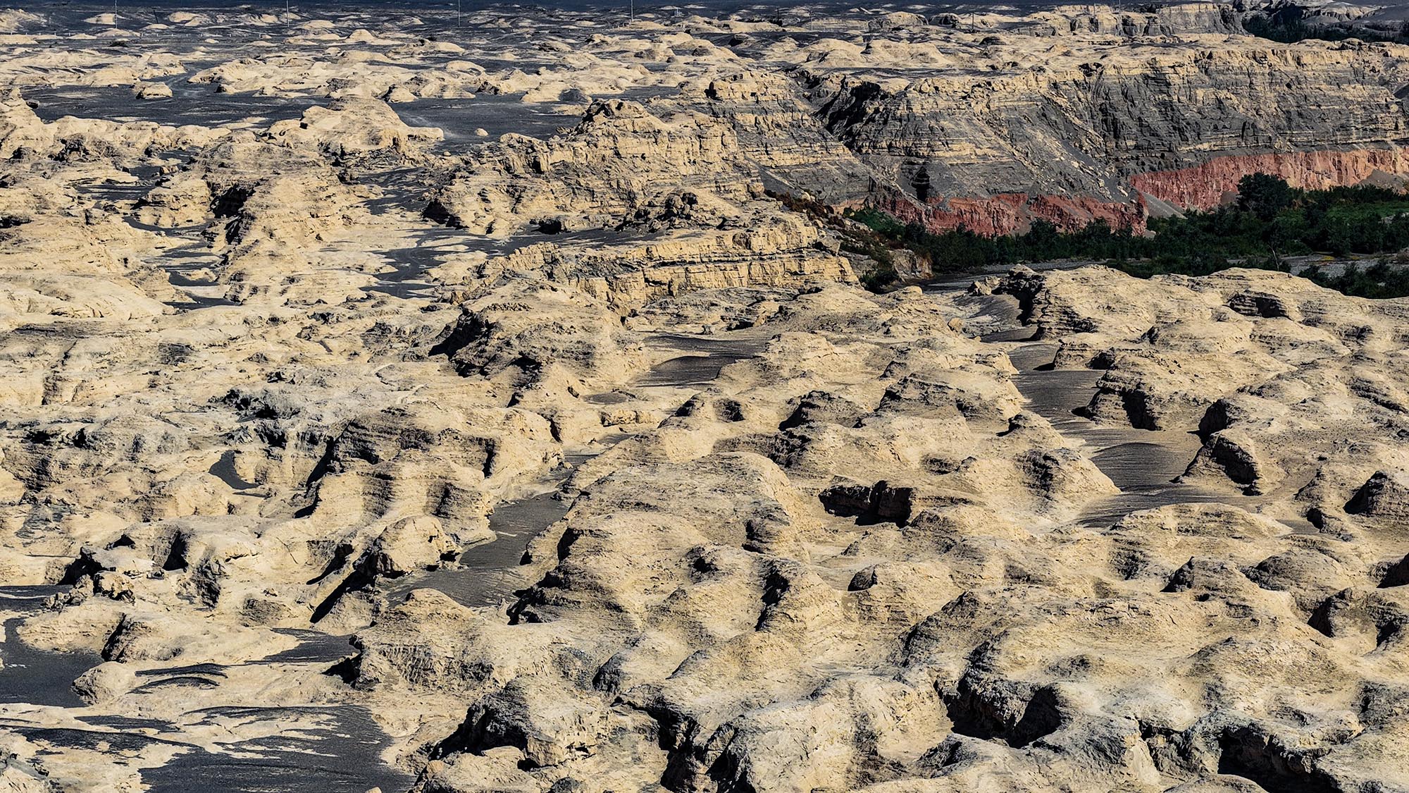 穿行其间,可见地貌单元错落交织,既有巨龙昂首般的冲天岩柱,亦有森严如中世纪城堡的层叠台地;凝固的惊涛定格成波浪形山脊,风化裂隙勾勒出舰队远征的磅礴阵列。这片奇幻之境与白杨河、天山红河谷毗邻共生,盛夏时节,赭黄的雅丹群、赤焰般的红河谷、翡翠般的白杨河交相辉映,构成瑰丽的地质奇观。