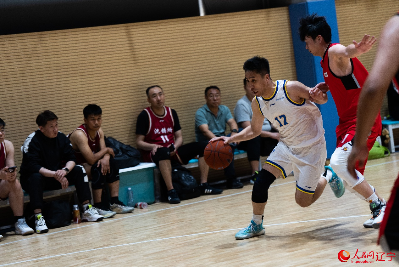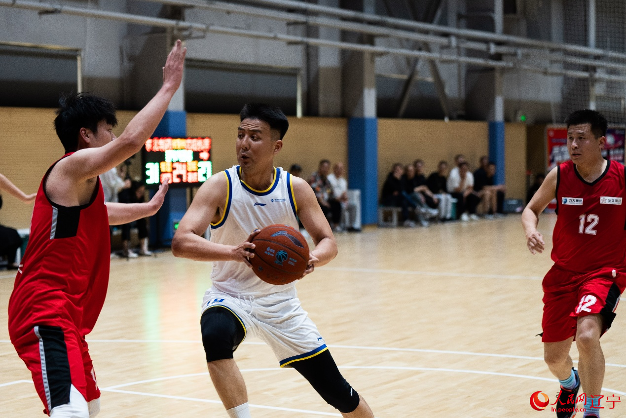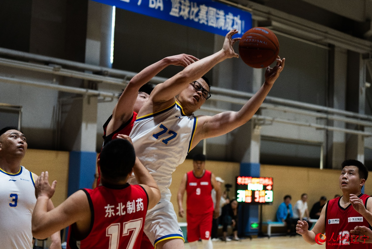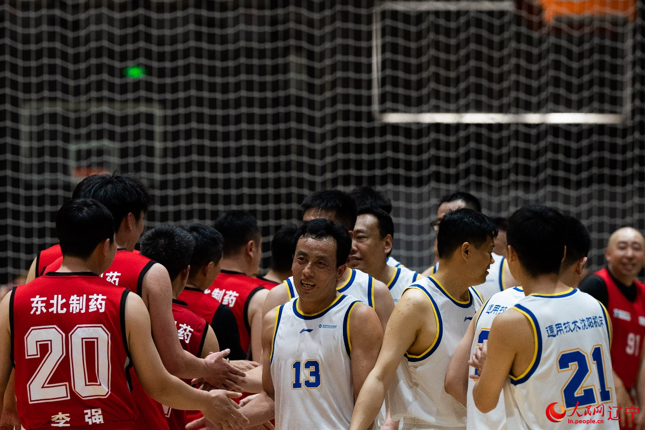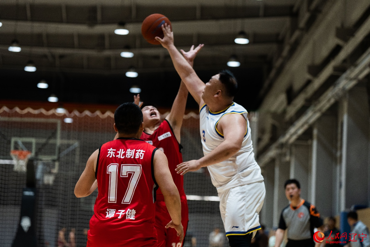 “唰!”篮球应声入网,球网随之轻轻翻动,进球的东北制药队队员与场边队友击掌庆祝。