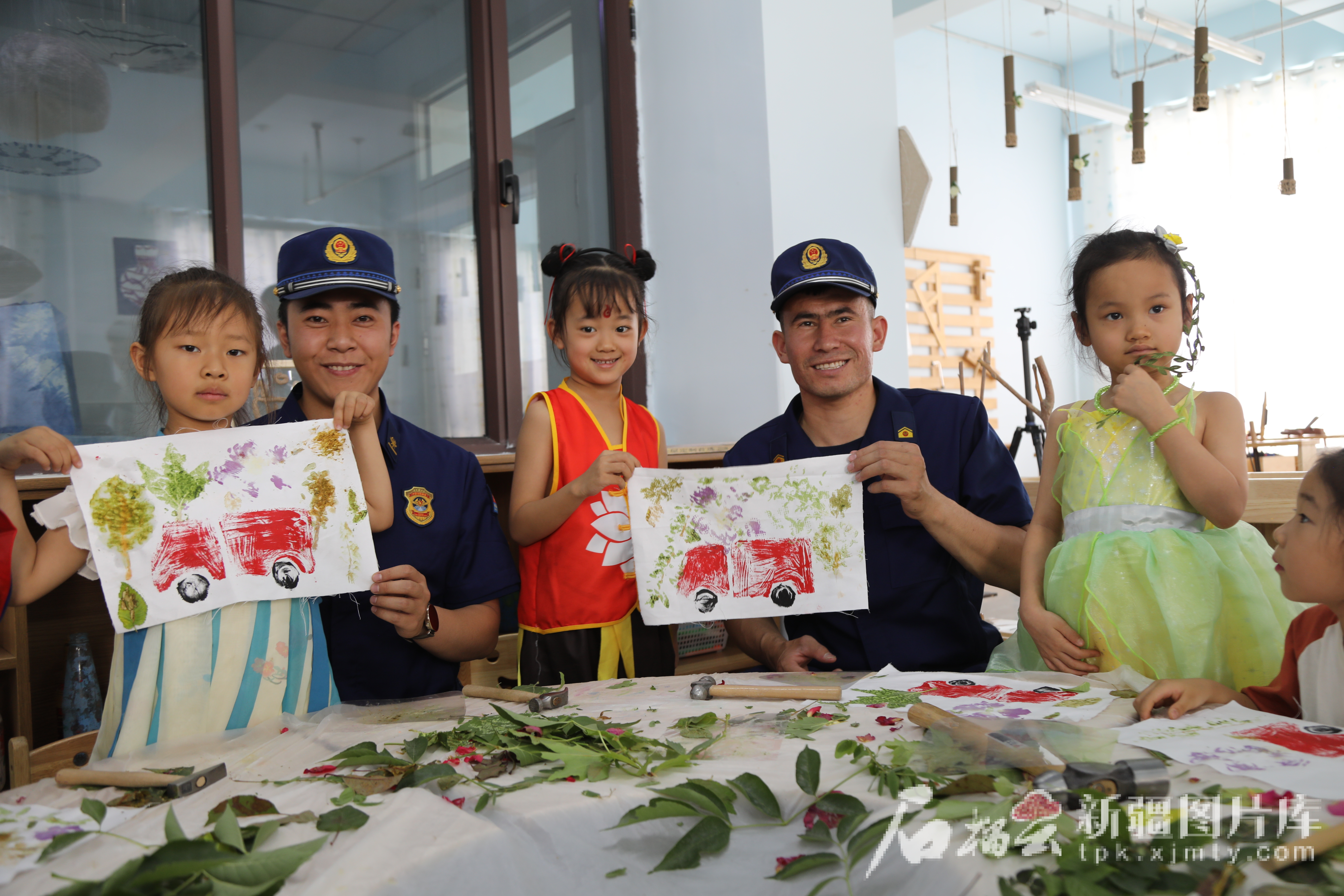 消防员与孩子们用颜料拓印出消防车。王嘉露摄