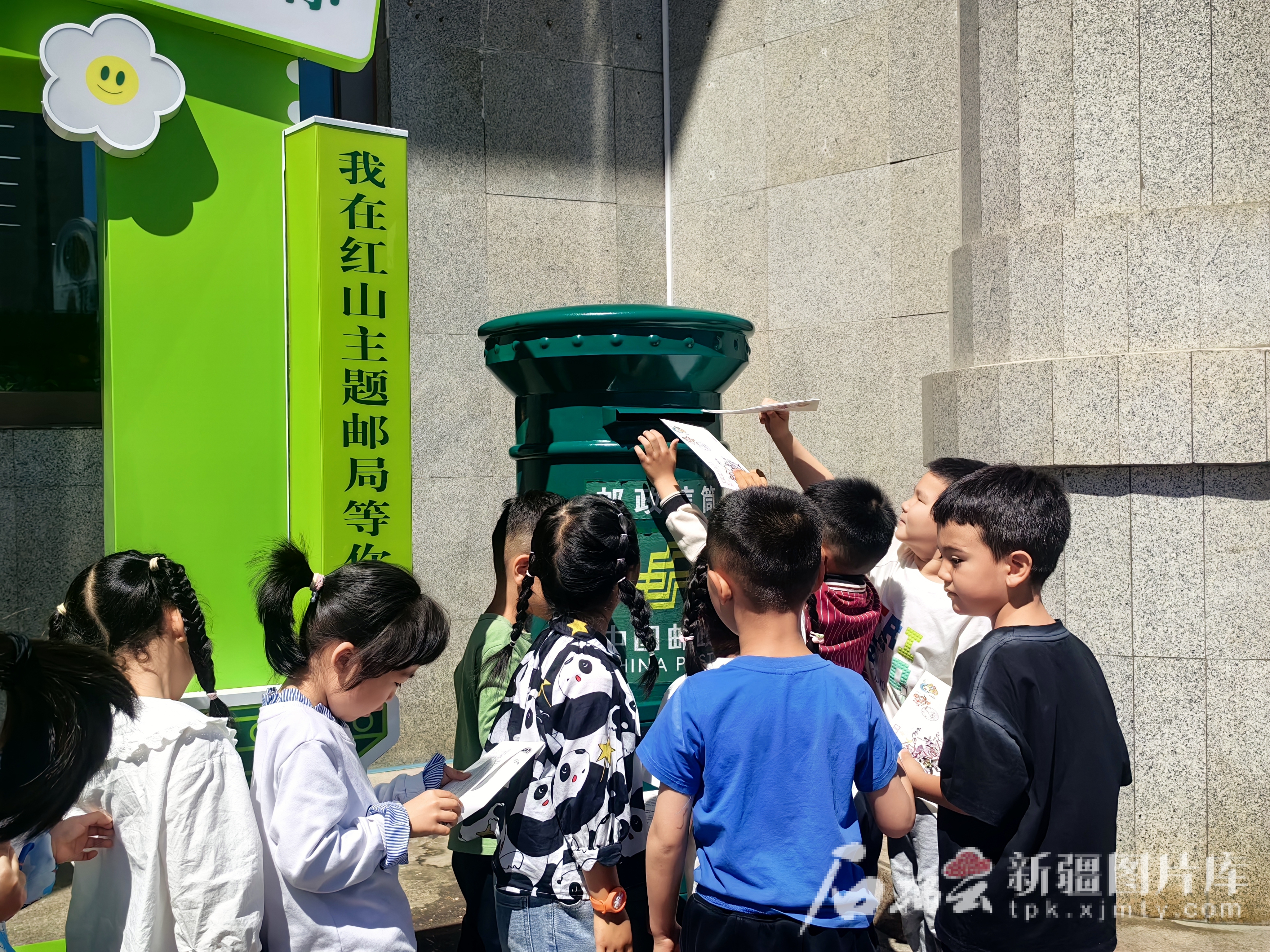 小朋友在中国邮政集团有限公司乌鲁木齐市分公司扬子江路支局体验投递信件。林相成摄
