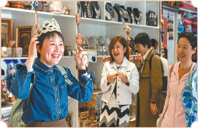 在新疆阿图什市的克州民俗风情园,游客在观看玛纳斯演出后选购民族服饰。新华社记者 王 菲摄
