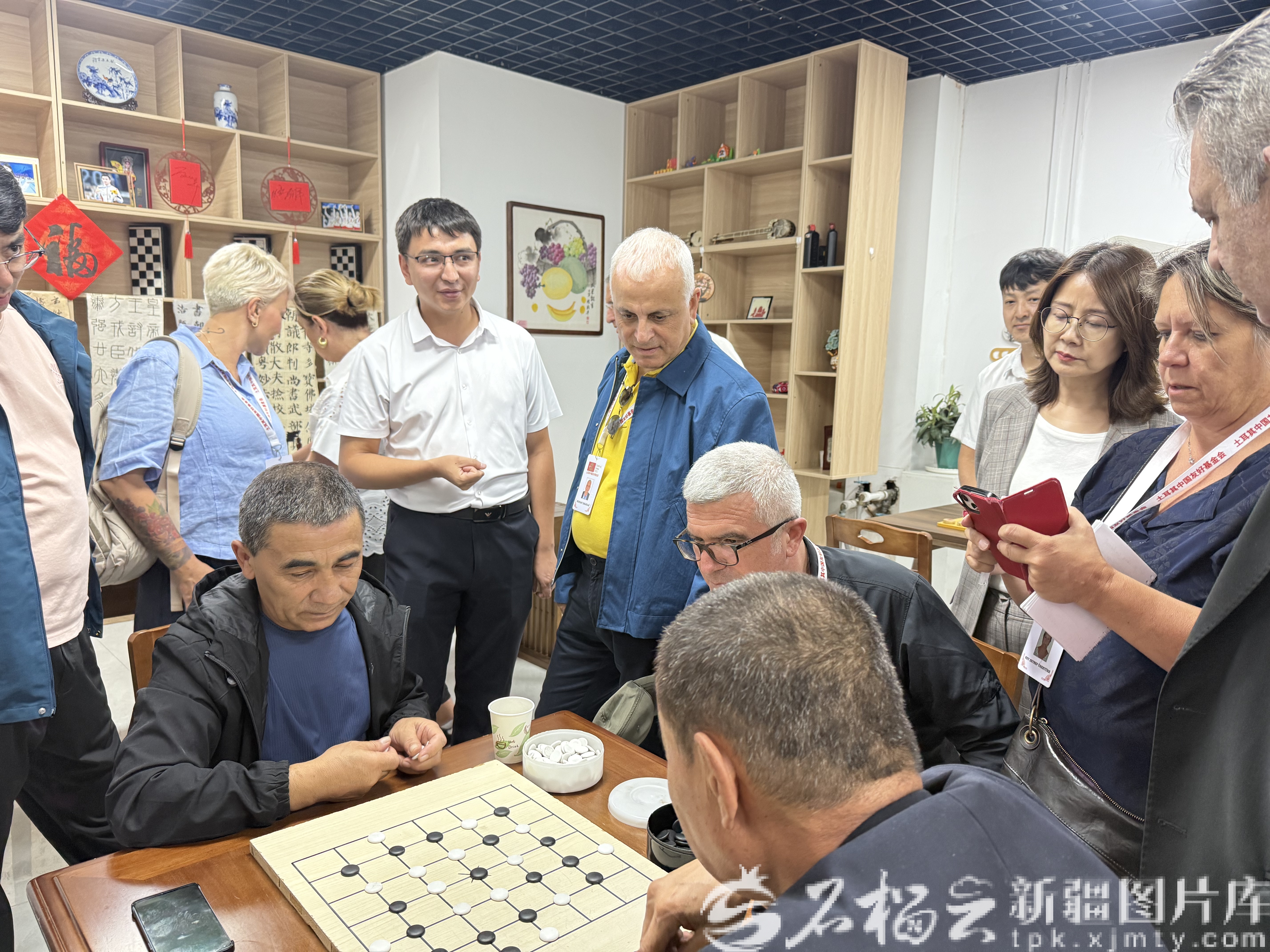 9月1日,土耳其媒体代表团一行来到乌鲁木齐市天山区黑甲山街道跃进街南社区,众人对活动中心一场棋局兴趣颇浓,驻足观看。石榴云/新疆日报记者 郭倩摄