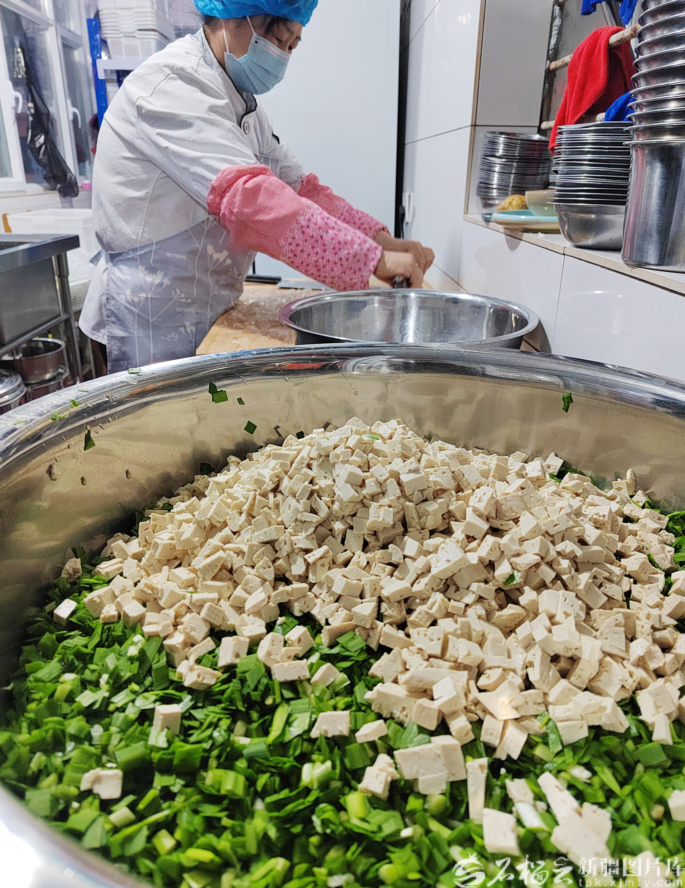 工作人员在后堂准备晚餐食材。