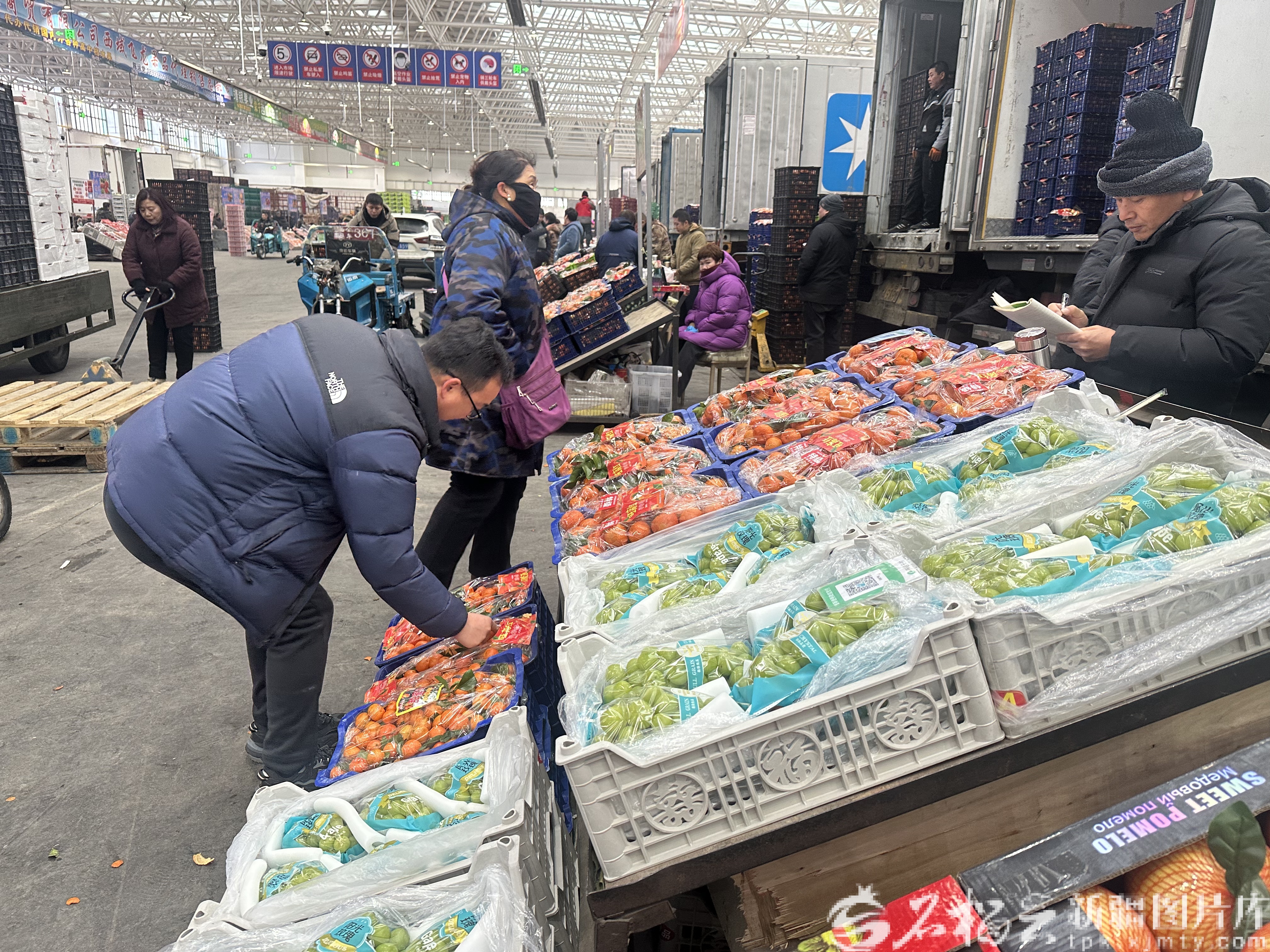 除果蔬外,九鼎市场干果、副食百货、冻品海鲜及畜禽肉区商户均加大备货量。新疆九鼎农产品经营管理有限公司副总经理冯娟介绍,市场坚守稳价保供底线,严格落实食品安全检查,对进出市场的货运车辆实行车车必检。