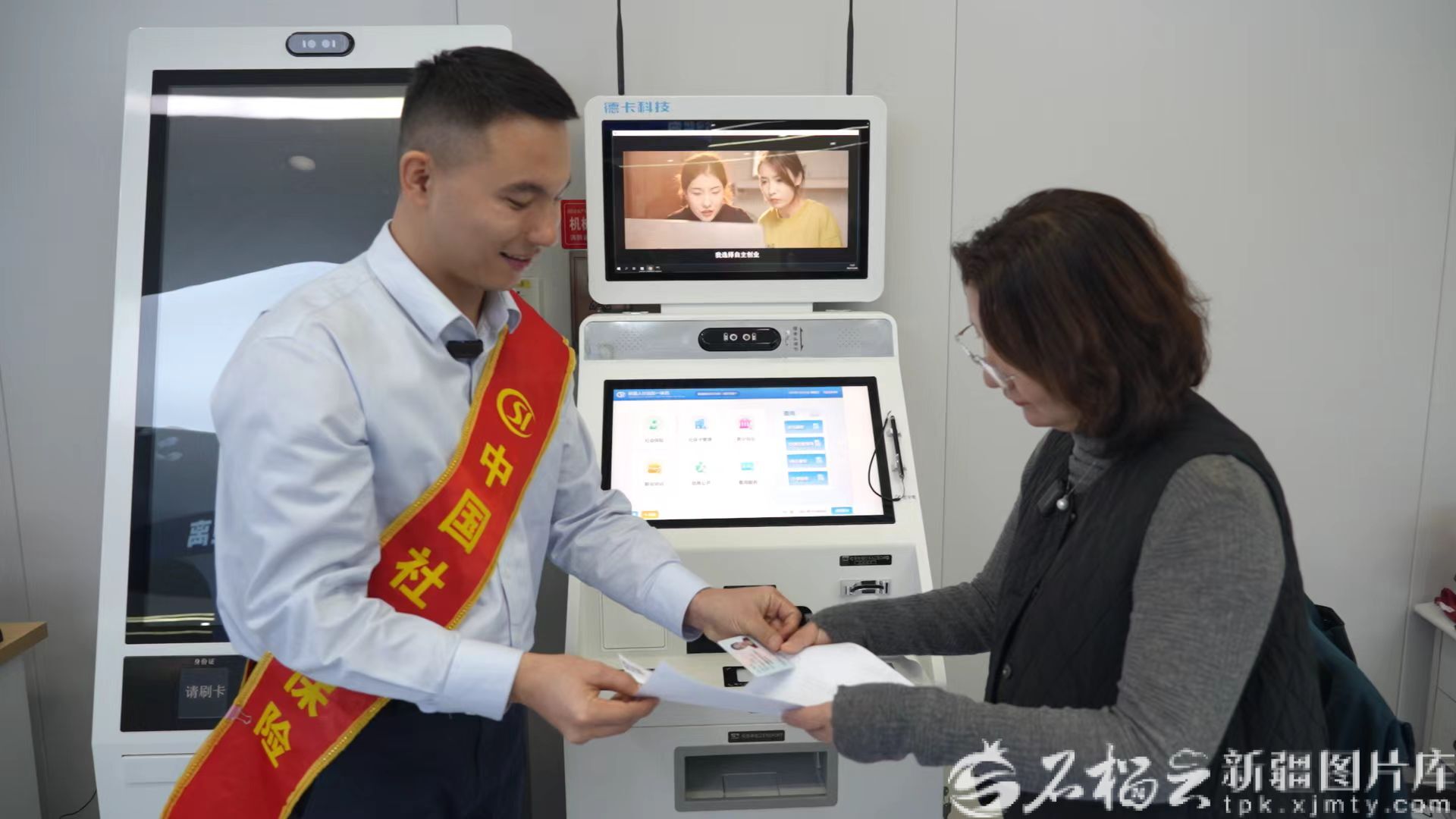 近日,自治区社会保险中心办事大厅内,工作人员指导参保群众使用自助一体机办理业务。自治区社会保险中心供图