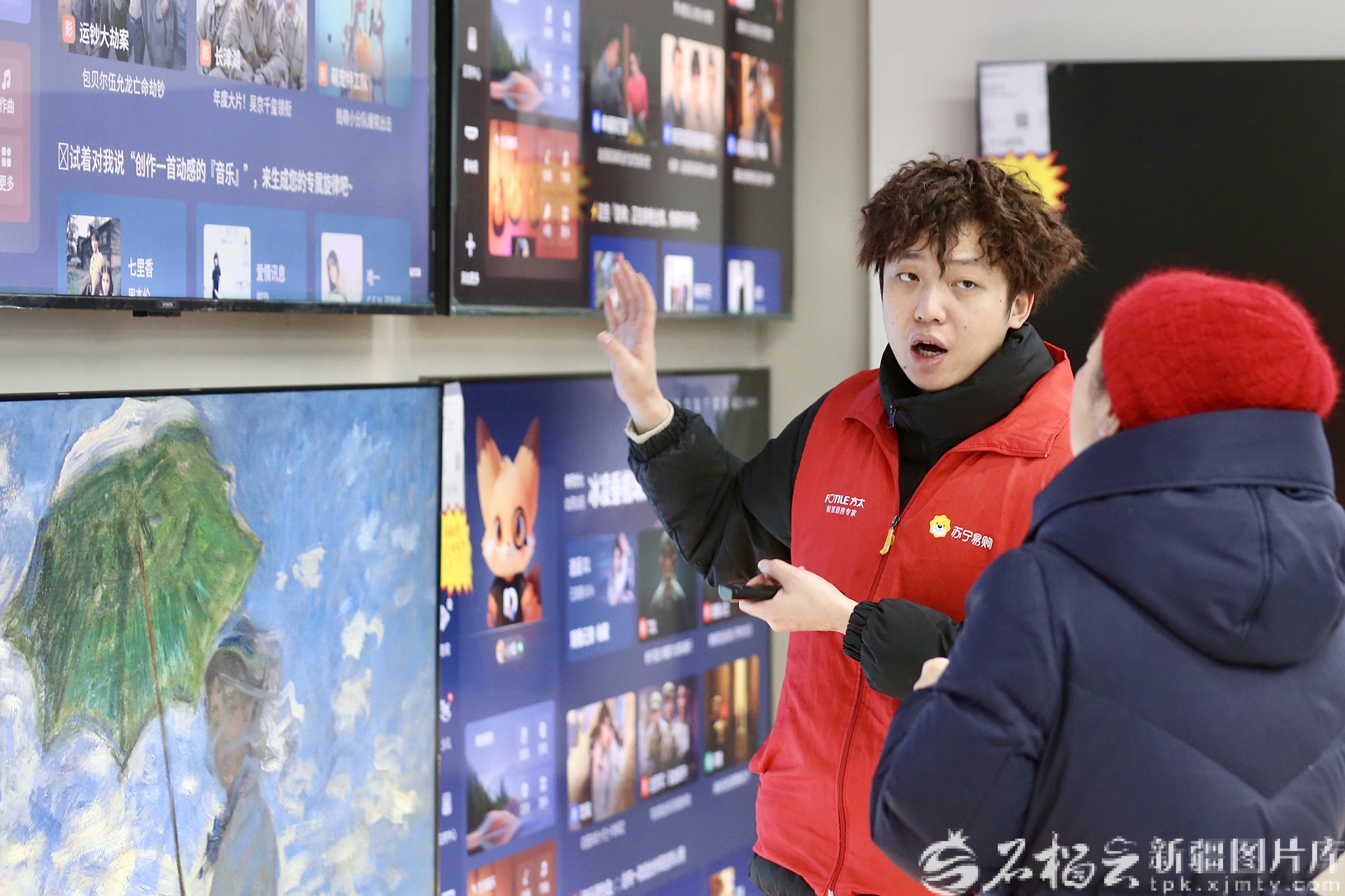 1月15日,苏宁易购乌鲁木齐市人民广场店,导购正在向顾客介绍电视。
