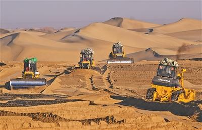 数十台推土机轰鸣作业,推筑阻沙堤、平整沙丘,本地农户忙着收割加工芦苇、铺设草方格,冬季治沙工程高效推进。
