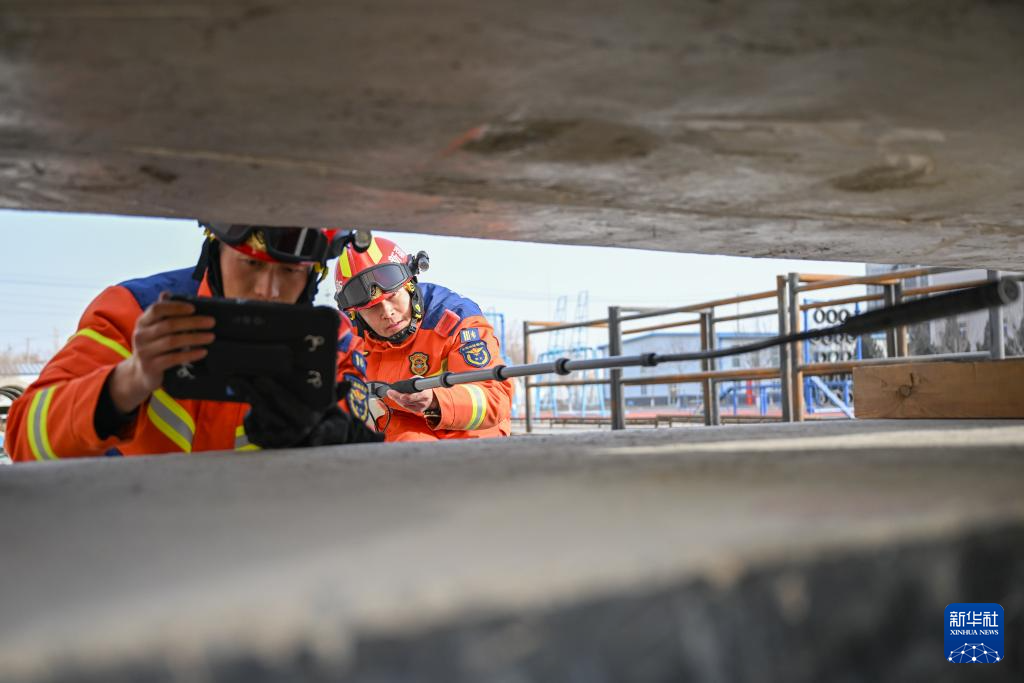 1月22日,在新疆乌鲁木齐消防救援机动支队库尔勒大队,消防员利用音视频生命探测仪,模拟对狭小空间内被困人员进行搜索。