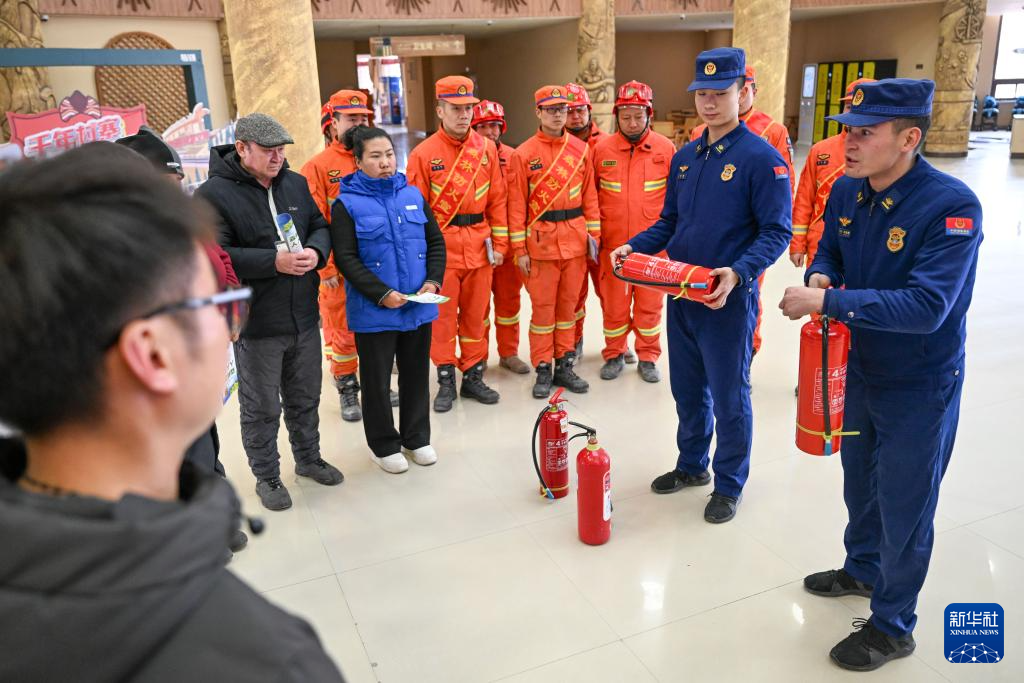 1月23日,在新疆巴音郭楞蒙古自治州罗布人村寨景区,消防员向工作人员宣传森林防灭火常识,并组织现场操作培训。