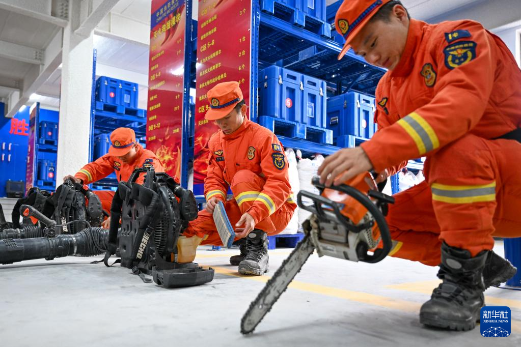 1月23日,在新疆乌鲁木齐消防救援机动支队库尔勒大队,消防员对风力灭火机和油锯进行维护保养。