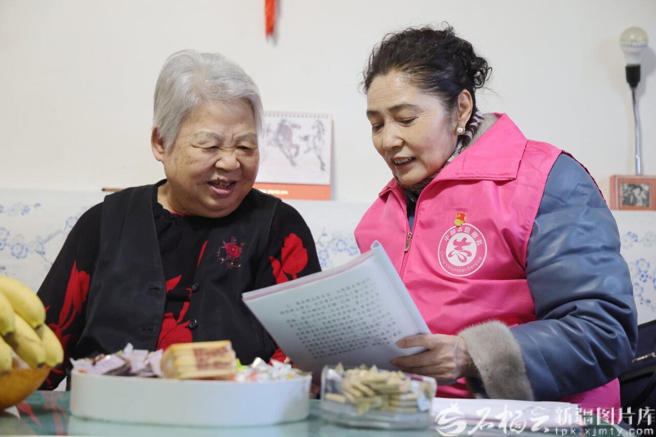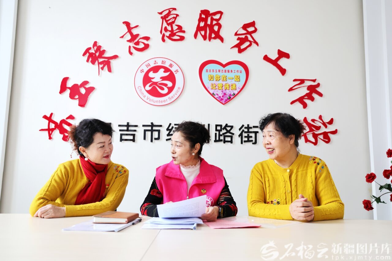 1月14日,苏玉琴(中)与志愿服务团队成员交流,征求大家对拟提交2026新疆两会提案的意见建议,让提案更贴合基层服务实际。