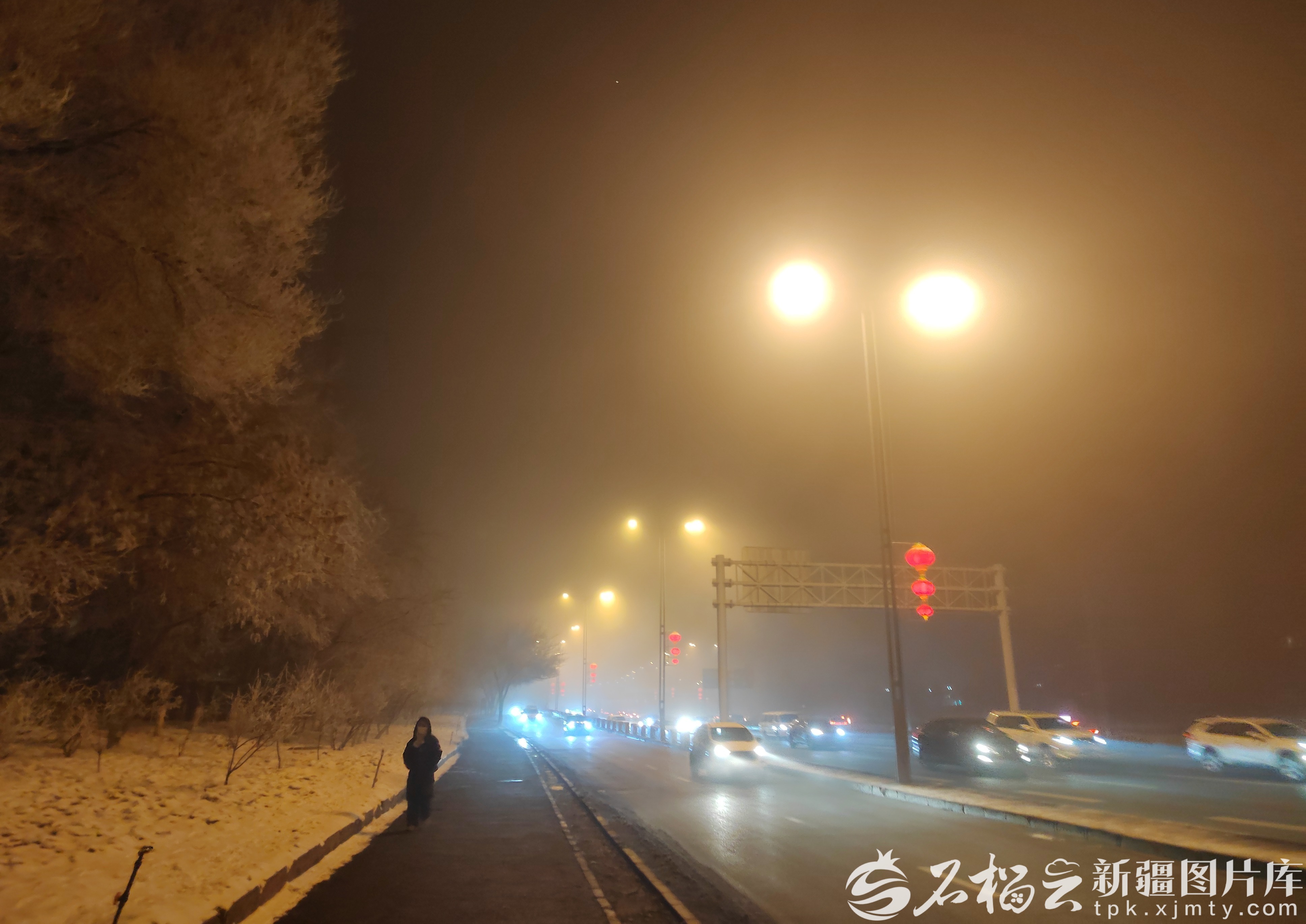 1月30日8时43分,车辆行驶在弥漫雾气的乌鲁木齐市河滩快速路上,行人从满是雾凇的树下走过。石榴云/新疆日报记者 邹懿摄